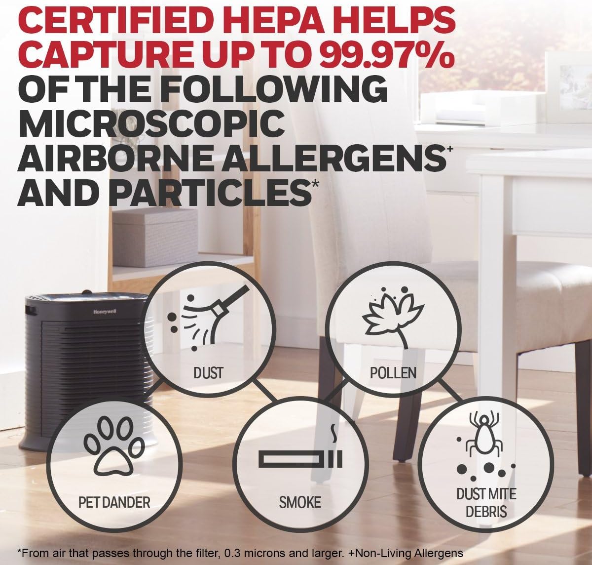 This Honeywell HPA200 HEPA Air Purifier includes a Certified Honeywell HEPA Filter that helps capture up to 99.97% of the following microscopic airborne allergens and particles: dust, pollen, pet dander, dust mite debris and smoke.* Recommended for large 310 sq. ft rooms. This Honeywell air purifier can filter & circulate air up to 4.8 times an hour. If you have pets or stale indoor air, air purifiers help deliver cleaner, fresher air. This Honeywell HEPA Air Purifier is part of our Allergen Plus series. This product earned the ENERGY STAR label by meeting strict energy efficient guidelines set by the U.S. EPA. Always purchase Genuine Honeywell replacement air purifier filters. They are certified to help capture odors and the following microscopic airborne allergens and particles* dust, pollen, pet dander, dust mite debris and smoke. Other compatible filter replacements are not guaranteed to offer the same performance or efficiency. Quiet air purifier has easy to use touch controls, a filter change indicator & reset, 2, 4 or 8 hour automatic shut-off timer and a control panel dimmer. Backed with a 5-year warranty. Disclaimers: *From the air that passes through the filter, 0.3 microns and larger. **Based on 3rd party independent CADR testing for the smoke CADR value when operated at the highest level. Air circulation depends on many factors, such as room size and configuration. There is no guarantee that all of the air in a room will pass through the filter. The ENERGY STAR name and mark are registered trademarks owned by the U.S. EPA. The third-party testing for the R filter efficacy was done by LMS Technologies, Inc. on July 28, 2022.