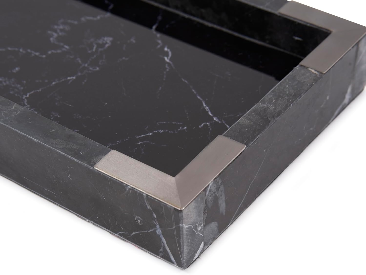 A Classic shape and contemporary materials combine to give us this unique tray for any decor. This Black Mirrored Marble Tray features a body of black marble trimmed with brushed titanium accents. What is truly striking is the mirrored surface of the tray that is printed to appear as marble.