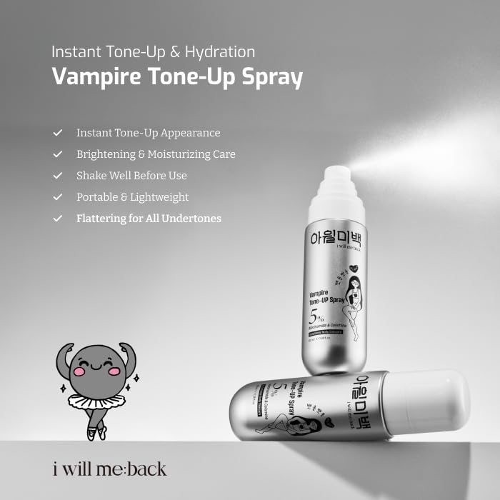 i will me:back Vampire Tone-Up Spray is a lightweight body mist designed to deliver an instant, temporary tone-up appearance while keeping skin feeling hydrated and comfortable. The fine spray applies evenly to help skin look smoother and more even in appearance. Formulated with 5% Niacinamide, it supports a balanced-looking skin tone, while moisturizing ingredients help prevent dryness. The portable spray format makes it easy to use on visible body areas for a natural, flattering finish that complements all undertones. Ideal for quick touch-ups as part of your body care or styling routine. This product provides a cosmetic tone-up effect only and does not permanently change skin tone.