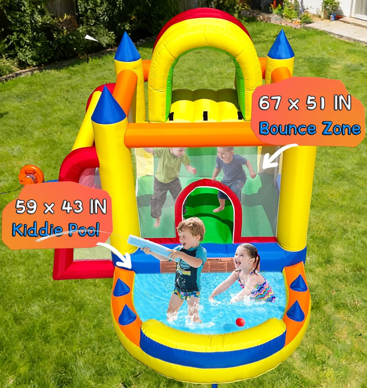 | Included Components | Bounce House Blower × 1, Bounce House × 1, Bouncy Castle Repair Kit x 1, Carrying Bag x 1, Ground Stakes x 10 |