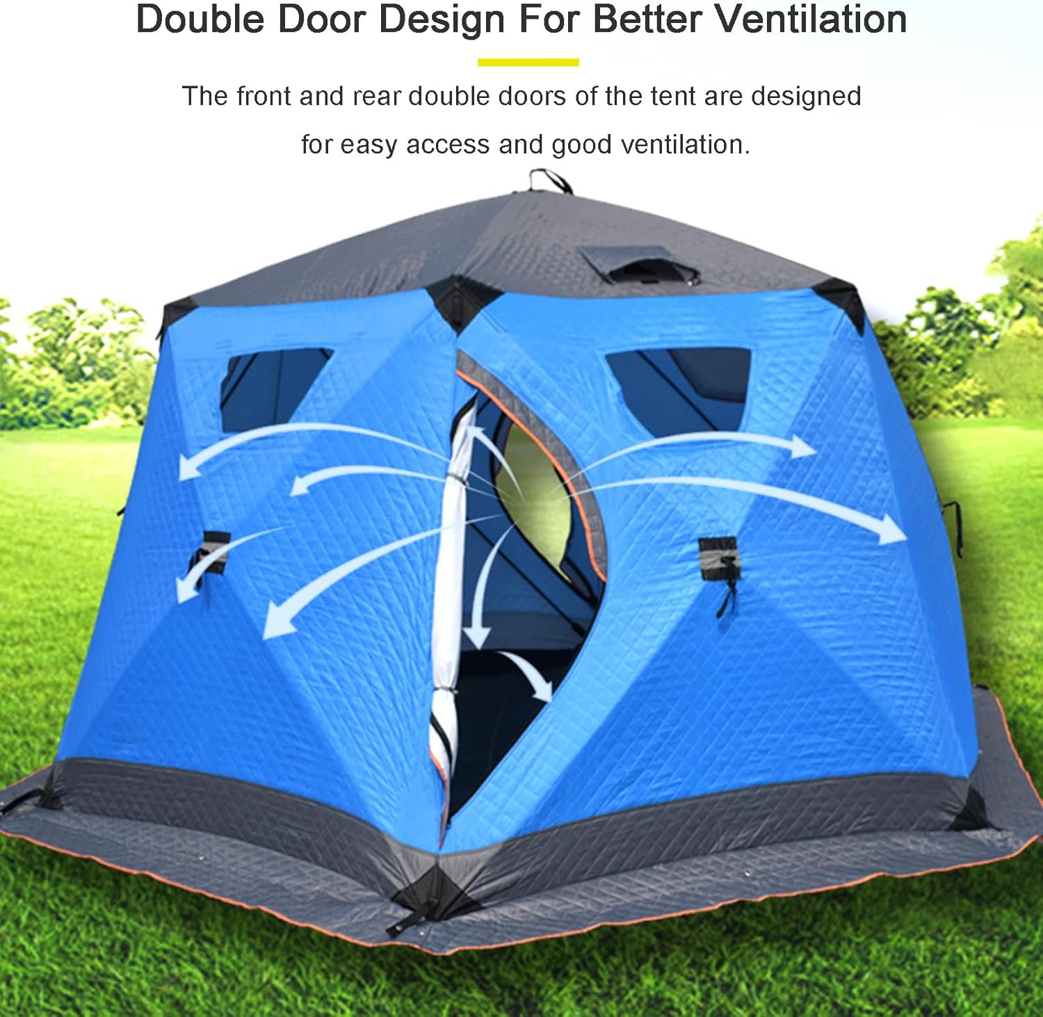 Lightweight Insulated Ice Fishing Shelter, Waterproof Portable Pop-up Ice Fishing Tent Ice Shanty with 2 Doors and Carrying Bag Feature: Enough space for 4-5 persons. Stakes and cord loops are used to add stability on windy days. Zippered doors for you to enter the tent easily and freely. Transparent window design, air-permeable window, four-window design, good lighting. Quick-open ice fishing tent with pull tabs for easy lifting. Comes with a carry bag to store the ice fishing tent for easy transportation. Specification: Name: Portable Hub-Style Ice Fishing Shelter Bracket material: 11MM diameter solid fiberglass tube Fabric material: 210D Oxford cloth Size: 240*240*190CM Package Size: 24*24*150CM Weight: 14KG Packing List: 1*Ice Fish Shelter 4*Ice nail 4*windproof rope 1*storage bag