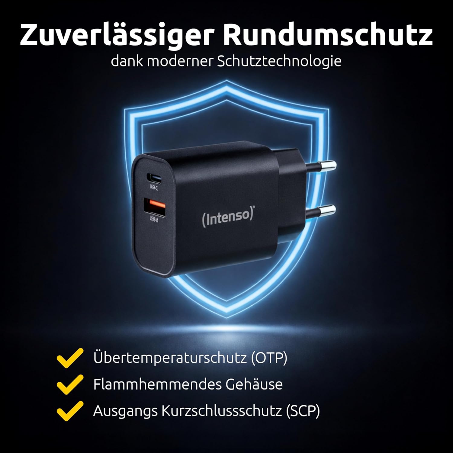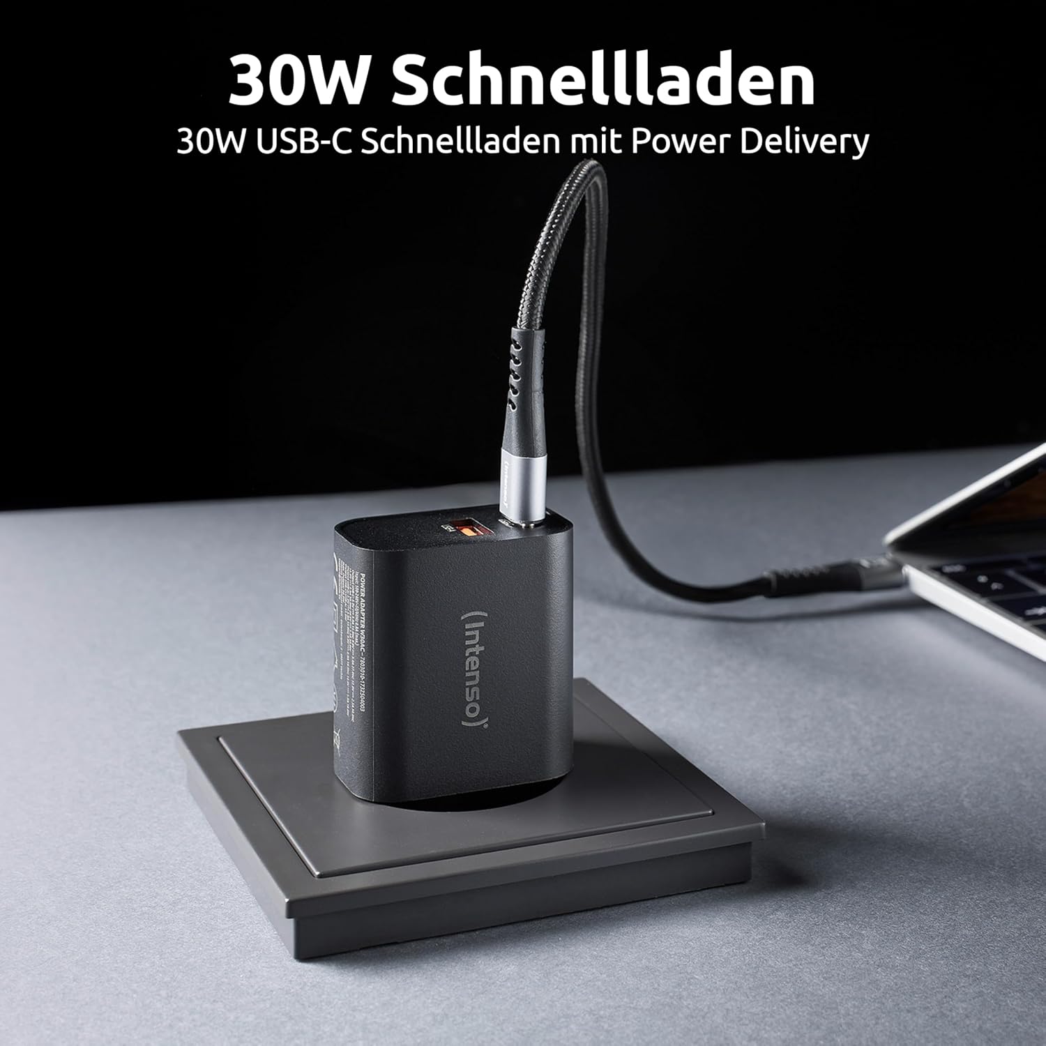 The W30AC power adapter is the perfect solution for anyone who appreciates fast, safe and efficient charging. Equipped with the most modern fast charging standards (PD 3.0, PPS, QC 4.0), it provides up to 30W of power via the USB-C port, ideal for smartphones, tablets and more. With the combination of USB-A and USB-C, you can charge two devices simultaneously without compromising performance. Its compact design and light weight make it the perfect companion for travel, office or home. The high energy efficiency and minimal power consumption in standby mode underline the sustainable requirements of this charger. Tested in Germany and manufactured to the highest quality standards, the W30AC power adapter stands for reliability, safety and durability. Why Intenso Because you deserve a charger that is not only powerful, but also efficient, compact and tested, for a worry-free charging experience.