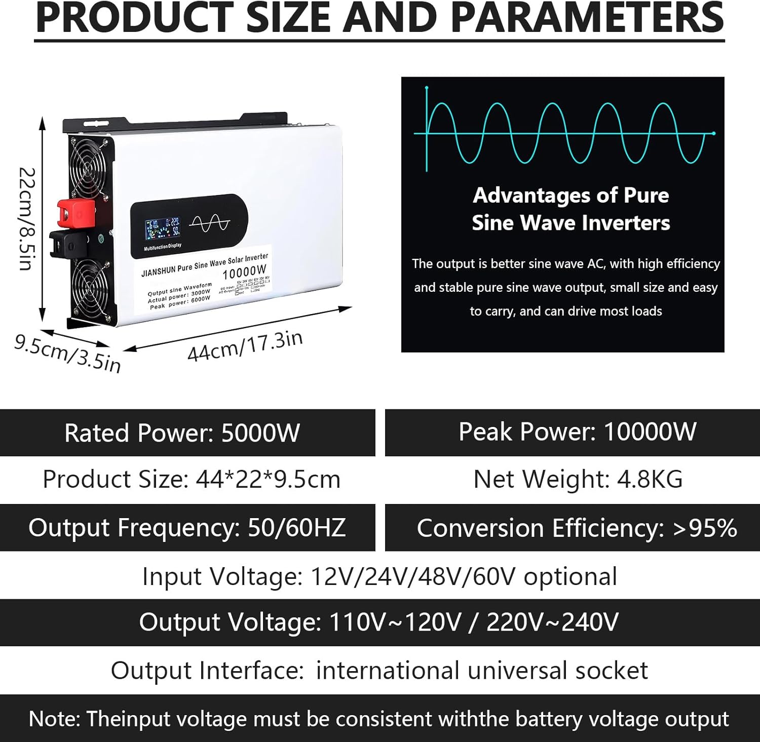 Ever dreamed of camping under the stars without sacrificing modern comforts? What if you could charge your phone, run a mini-fridge, or even power a projector for outdoor movie nights—all from the middle of nowhere? Pure Sine Wave Inverter Inverter turns "what if" into reality! Our ultra-efficient inverter delivers pure sine wave power—safe for all your sensitive electronics. Compact enough to toss in your backpack, yet powerful enough to run essentials for hours.Parameters:Model 5000:Rated power: 3000WDimensions: 34*19*9cmNet weight: 2.8kgModel 6000:Rated power: 3000WDimensions: 34*19*9cmNet weight: 3kgModel 8000:Rated power: 4000WDimensions: 39.5*22*9.5cmNet weight: 3.8kgModel 10000:Rated power: 5000WDimensions: 44*22*9.5cmNet weight: 4.8kgInput voltage: 12V/24V /48V/60VOutput voltage: 110V/220V/230VOutput frequency: 50/60HZConversion efficiency: >95%Packaging:Packing box*1Inverter*1Connecting wire*2Clip*2Note:5000W inverter, continuous power is 2500W, starting power is 5000W6000W inverter, continuous power is 3000W, starting power is 6000W8000W inverter, continuous power is 4000W, starting power is 8000W10000W inverter, continuous power is 5000W, starting power is 10000WIf you have any questions after receiving the package, please contact us as soon as possible, we will always give you a satisfactory answer.
