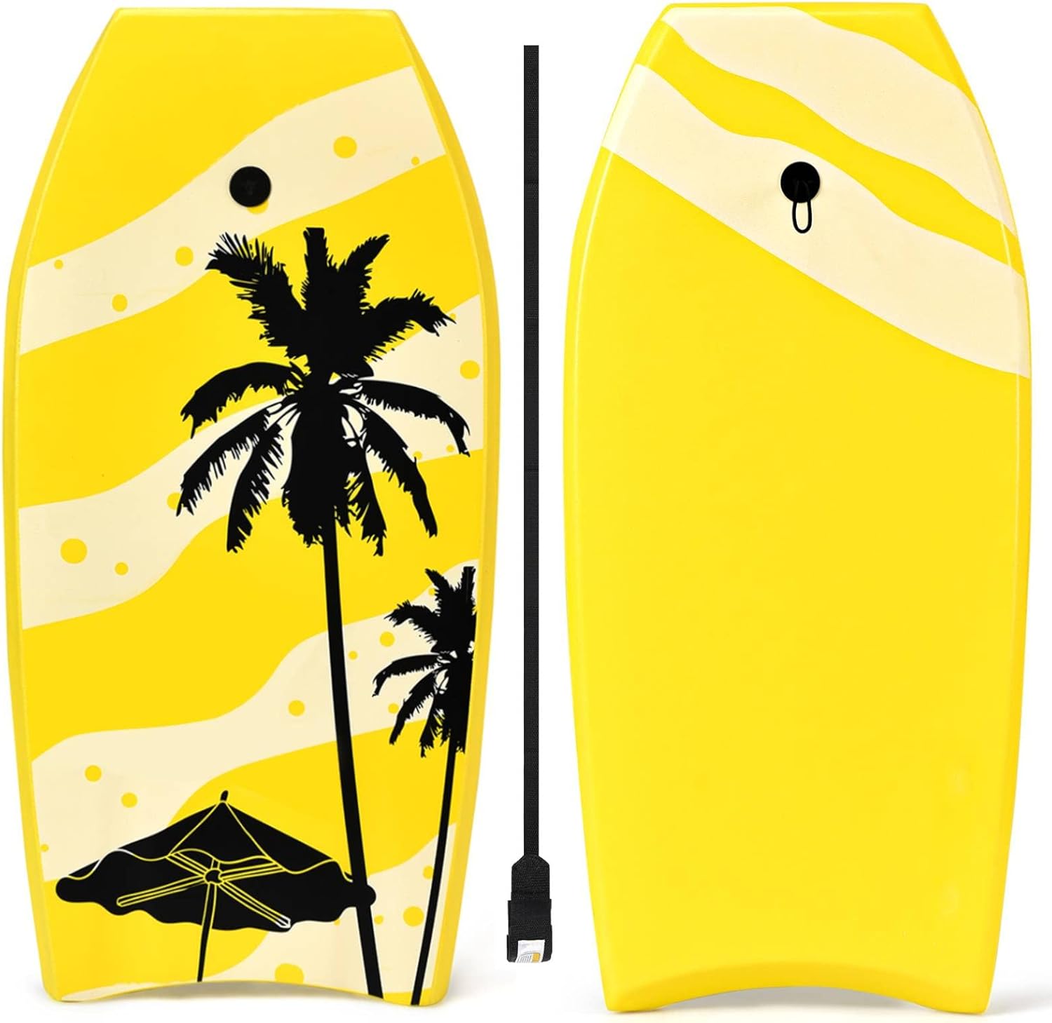 Available in three sizes for kids, teens and adults, and with a variety of attractive patterns, our board is the perfect complement to seaside sports and games.Features:✔ With the EPS core,XPE deck and HDPE smooth bottom for great buoyancy ✔ Made with lightweight polyethylene foam laminated, weighs only 1.5 pounds for easy carrying✔ Comes with a wrist strap to keep the board away from you in rough waves ✔ Crescent tail design for easy control and effectively increase the sliding distance and speed ✔ The bottom with 2 rear channels,which are suitable for all waves condition ✔ Available in 33, 37 and 41 inch, perfect for adults and teens, beginners and intermediates ✔ Available in a variety of colors and patterns and won't fade in the summer sunSpecifications:Color: Yellow Coconut Tree Material: XPE, EPS, HDPE Length of Leash: 35.5 inch>>>33 InchNet Weight: 1.5 lbsSize: 33’’ x 19’’ x 2.36’’ (L x W x H)Weight Capacity: 89 lbsRecommended Age: Up to 10 years old>>>37 InchNet Weight: 1.7 lbsSize: 37’’ x 19’’ x 2.36’’ (L x W x H)Weight Capacity: 122lbsRecommended Age: Over 12 years old>>>41 InchNet Weight: 1.9 lbsSize: 41’’ x 20.5’’ x 2.36’’ (L x W x H)Weight Capacity: 189lbsRecommended Age: Over 14 years oldPackage Includes:1 X Body Board 1 X Leash