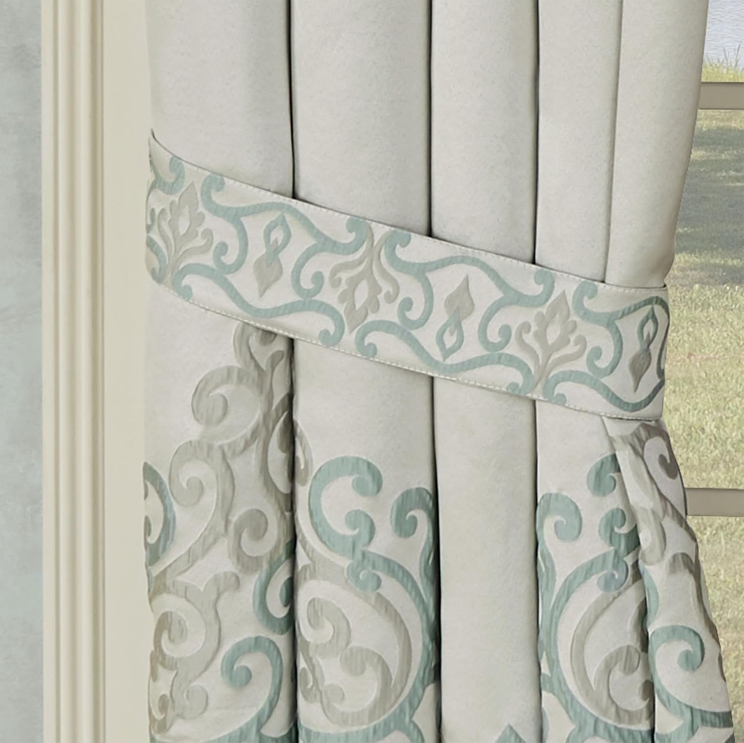 The Avalon Window Treatment showcases radiant beauty. This luxurious, lined polyester window components feature jacquard-woven scroll designs in silver-gray and spa on oyster. Each Ascot Valance has embroidered scrolls and a 3.5 inch long tassel accent. The tailored, wide curtains have scrolls at the bottom and include tiebacks. The Avalon Collection brings high-end elegance to your windows, perfect for traditional home decor. Tailored valance is 72"Wx18"L; wide curtain pair is 100 inches wide x 84 inches long. Curtains and tailored valances have 3 inch rod pockets. Dry clean. Imported.
