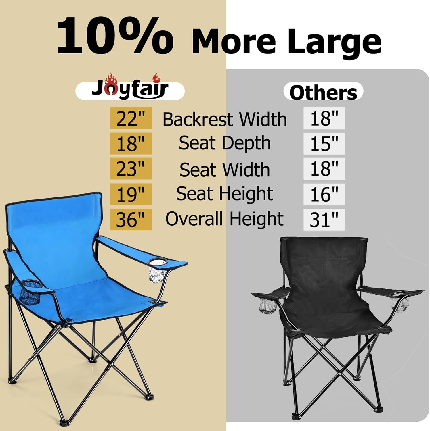 【PRECISION HEAT CONTROL】 A built-in lid thermometer for easy temperature control, Monitor the temperature in real time, No longer afraid of burning, Precisely control the internal temperature by adjusting the vents on each side of the grill without lifting the lid, A vertical chimney create a three-dimensional heating environment, Locking the juice of food even the freshness and tenderness 【GRILL RACK】 Cooking area 13.5’’x8.8’’, A good choice for 1-3 people grilling, Perfect to cooking burger patties, bacon, steaks, sausages, kebab, Stainless steel grilling rack with chrome plating does not release any harmful substance, Not easy to stick food and easy to clean, Thicker outer ring for better stuck in the groove to avoid slipping, Support heavy food with ease 【HEAVY DUTY】 TRIANGULAR STRUCTRUE - keeps standing stably on different grounds, Greatly enhances the stability of the whole grill, WOODEN HANDLE - Anti-scald for easily open and move, The upgraded buckles can be opened and closed smoothly, Firm enough to ensure will not popping open when carrying, 2 PULL RODS - Hold the lid in place to keep out the wind 【CONVENIENT & COMFORTABLE】 Our portable folding chair combines ergonomic designs with convenient features, The 21in wider backrest supports your back better, With a seat height of 19in and depth of 18.3in, Let your body be completely relaxed, And long armrests at the proper height get you in greater comfort, Dual mesh cup holders keep your favorite beverages and snacks within easy reach 【FOLDABLE & PORTABLE】 Our outdoor lawn chair is not require assemble, Can be opened and folded up effortlessly in seconds, Measure 21” x 21” x 36” when open and fold up to 6”x 36”, A compact size make them easy to store, Each chair weighs only 6 pounds(2.75KG), Includes a travel drawstring bag with shoulder strap, Allowing you to take them anywhere conveniently and get a easeful rest whenever you want