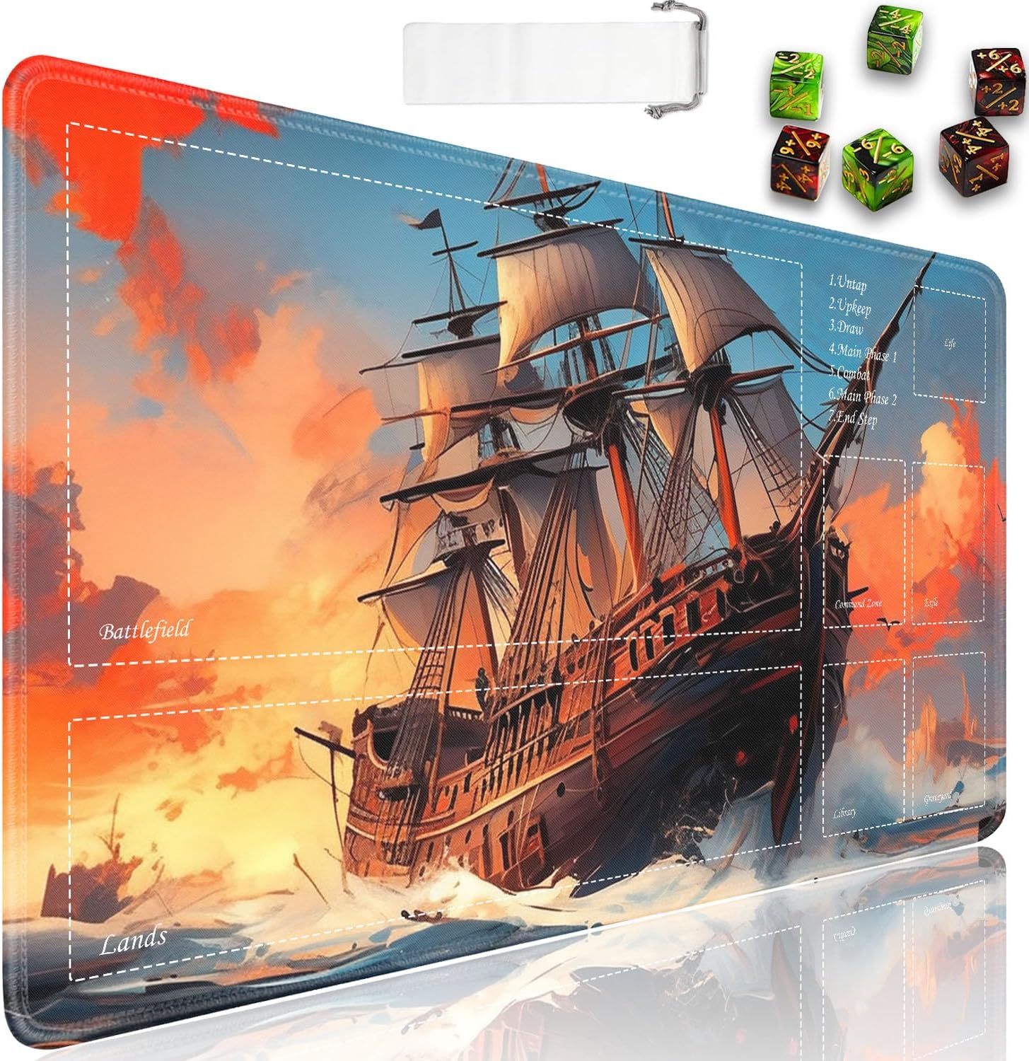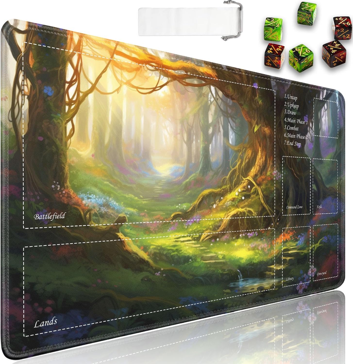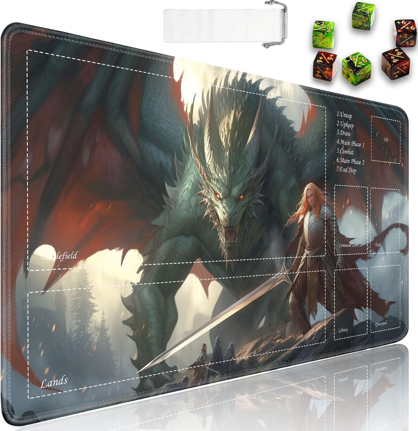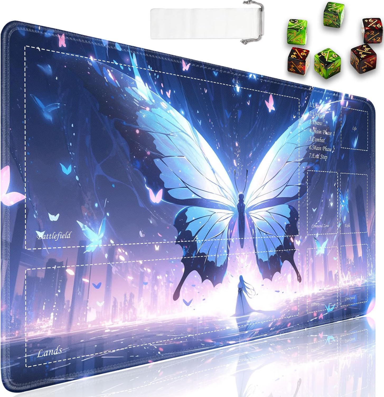 Perfect for use at home or on the go, our playmat provides card gamers with an organizer bag that rolls up the mat for storage and also protects it from dust, wrinkles and creases. It also comes with 6 dice counters. Crafted from premium materials, our playmats feature a non-slip backing and high-quality printing, a smooth surface for easy shuffling and to protect your deck from scratches and damage. So if you're looking for a cost-effective game mat or a great gift, check it out!