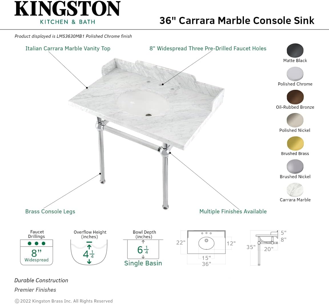 With a beautiful carrara marble counter top, this console sink set with back and side splashes is a long lasting, durable, and elegant addition to your bathroom. A fabulous alternative where space is limited or tight making them friendly for the whole family. With different shades and natural designs, otherwise known as veining, no two sinks will be alike. Also for your convenience, anti-slip rubber pads are included with the brass legs to ensure steadiness. Water supply kit, drain assembly, and the faucet are sold separately. Kingston's carrara marble tops are polished, but they are not sealed. Polished marble has a shiny surface and resists stains. Natural stone, even when polished, is still somewhat porous and does remain susceptible to etching by acidic compounds like fruit juice, vinegar, some cleaning solvents, etc. For customers that wish to further protect their investment the marble can be sealed. The following is intended solely for informational purposes. Kingston does not warranty nor accept liability for damages or other negative outcomes resulting from any treatment or coating applied to the countertop after purchase, whether applied by the customer or by a third party. For anyone unfamiliar with this nature of project, Kingston recommends consulting an experienced professional in your area. When looking for a sealant product, please be sure to seek a product specifically designed for use on polished marble, granite or other natural stone surfaces. Be sure to always avoid anything containing a citrus ingredient, acid ingredient, tung oil, linseed oil, or other natural oils. These can damage or discolor your marble.