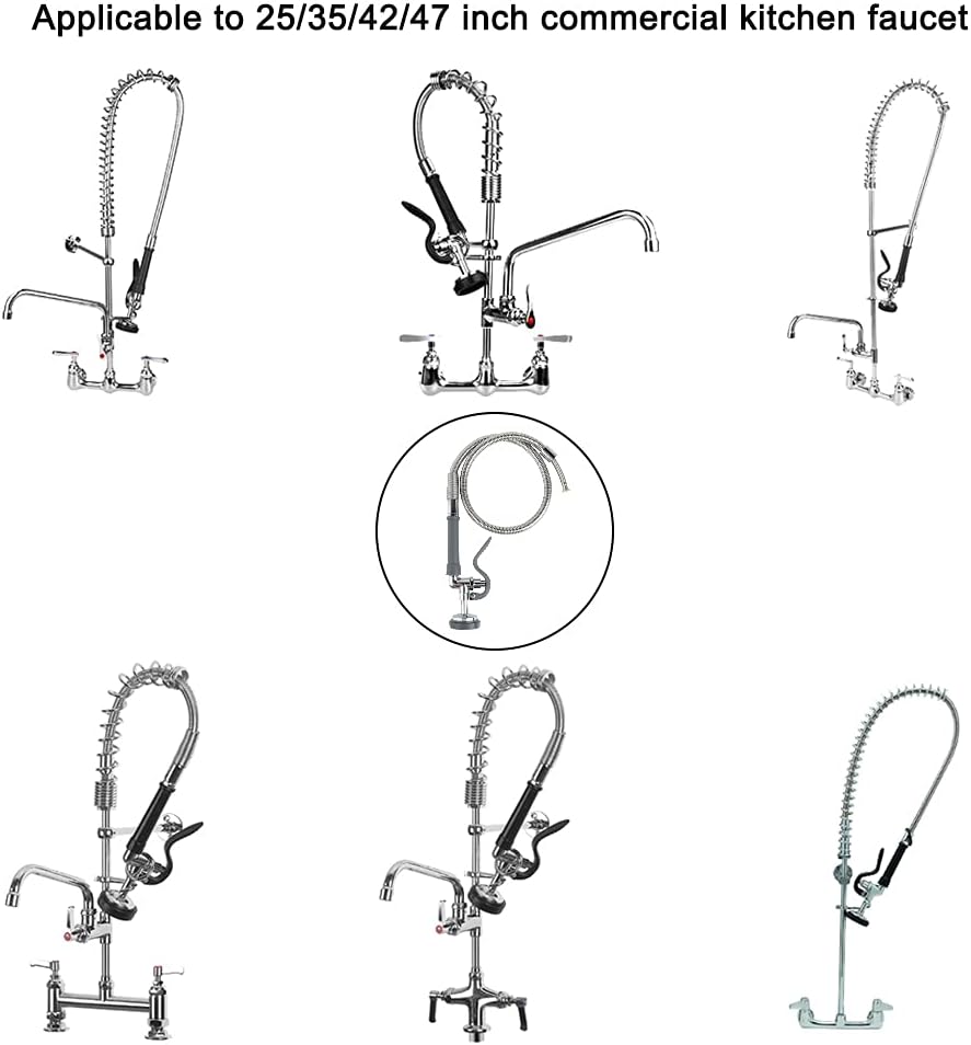 Pre-rinse faucet hose with spray valve replacement kit for all pre rinse commercial faucet.Pre-rinse Spray Features♠Surface Treatment: Multi-layer plating workmanship, polished chrome.♠Material: Made of POM plastic, anti-aging.♠Hand-free Design: Comes with a stainless steel ring, can be used to firmly, hold the handle without manual operation.♠Ergonomic Design: Ergonomic handle is comfortable for long time use, the handle is easy to turn back after use.♠Best for all brands commercial faucet, and also most commercial faucet with M22 add on spout that is also use this products.follow products: Asin: B07DXFRQWM Asin: B07P54KGX7 Asin: B07KF2JYMRAsin: B07KF4M9B2 Asin: B07P1RYL2HAsin: B07KBTXQFV Asin: B07JJ6MDBVAsin: B073WB5MJ3 Asin: B072BXCZVQAsin: B07JL9HSW5 Asin:B07KF8PDRX Specification:Stainless Length: 44Inch(111cm)Colour: GreyHose Material: Stainless steelHose connector Size: 7/8”-20NPT female thread(both sides the same)The Adapter Size: one side is M22*1 adapter, the other size 7/8”-20NPT male threadAnother Adapter Size: one side is 7/8 male thread, the other side is 1/2NPSM femaleTube material:EPDMSprayer handle material:PA nylonNozzle material:ABS+POMPackage Included:♠1* Commercial faucet stainless Hose♠1* Spray valve♠2* brass adapter♠1* stainless steel Ring♠2* Water Washers