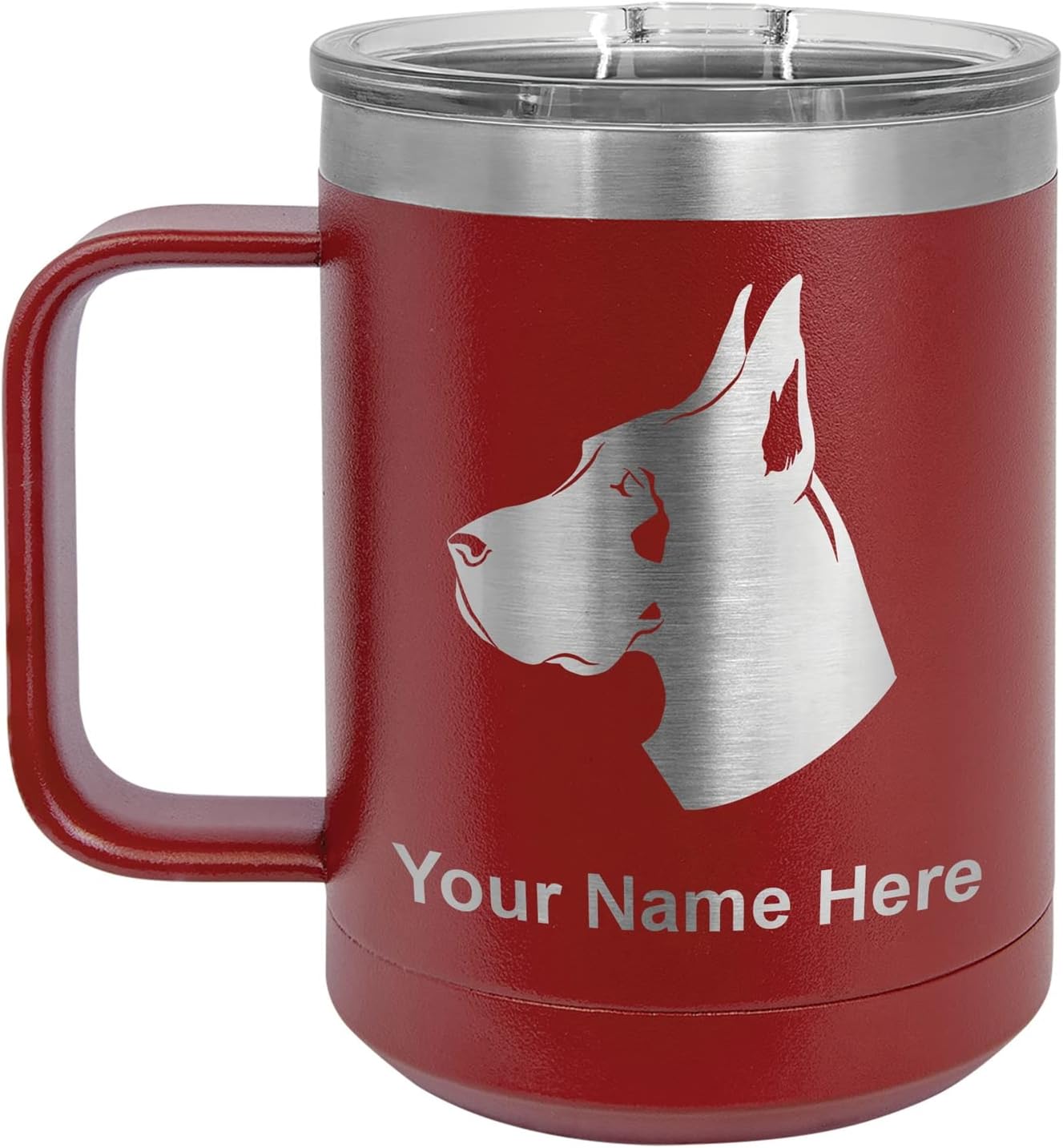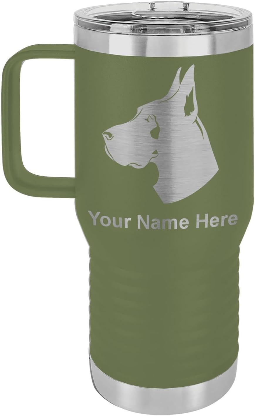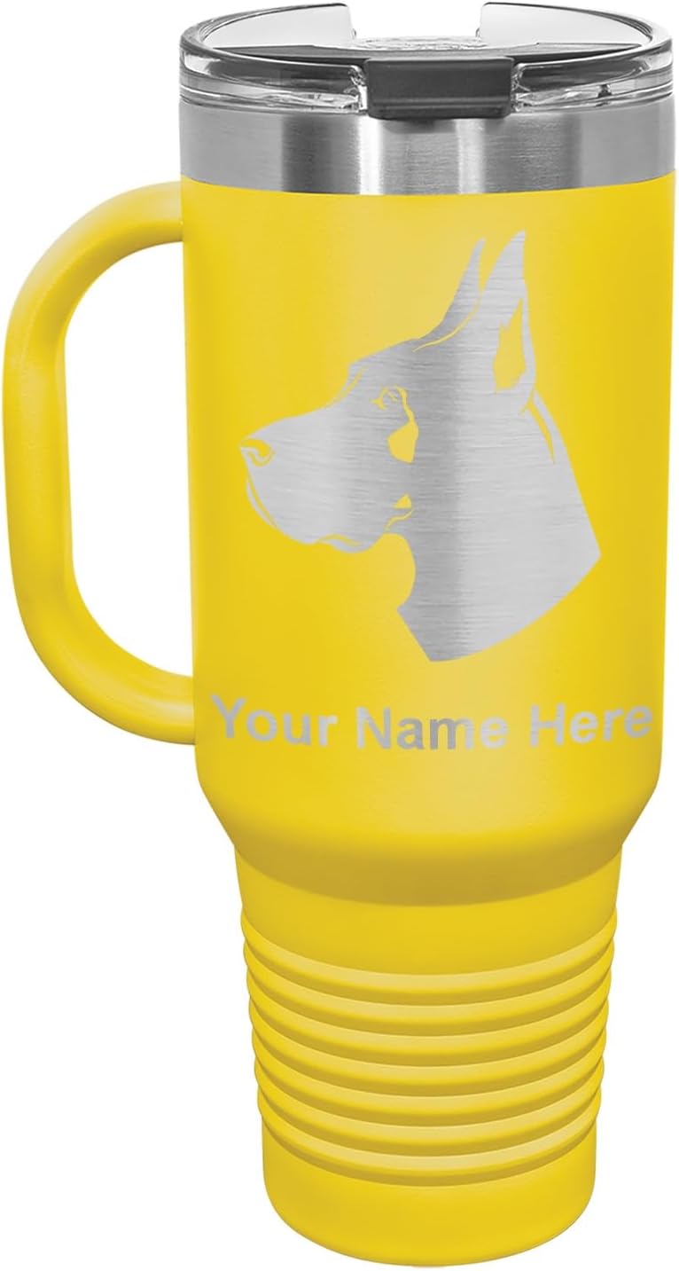 LaserGram 40 ounce Travel Mug with Handle that is laser engraved with the image that you see in the photo. Your own personalized text will be laser engraved below the image. Features double-walled stainless steel vacuum insulation with a clear lid. Click the "Customize Now" button to begin customizing your mug.