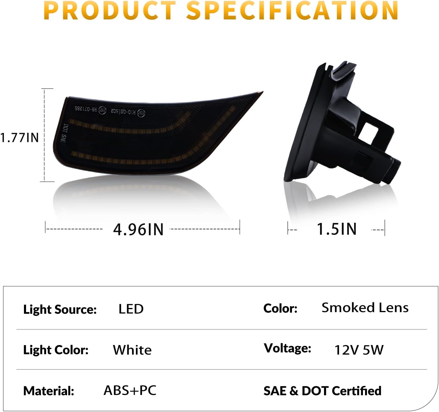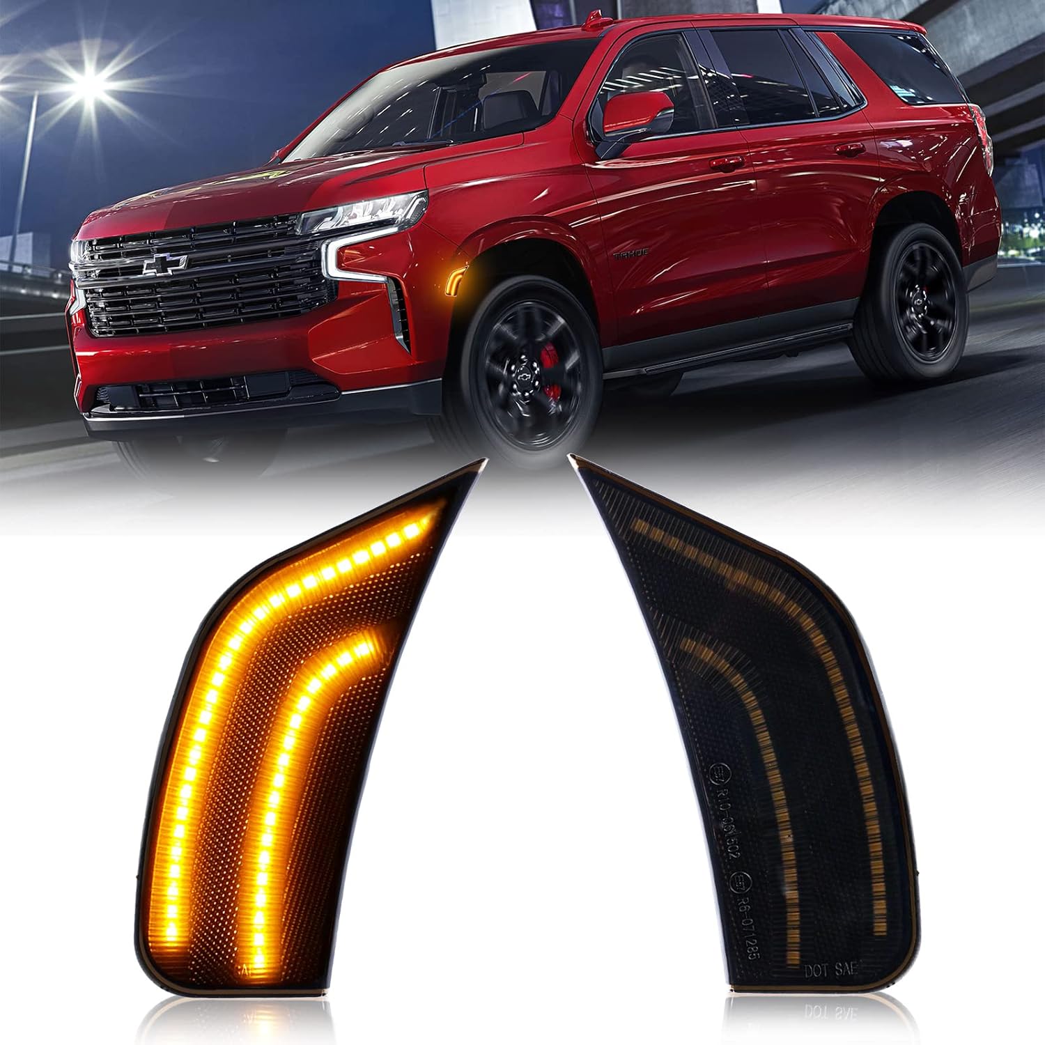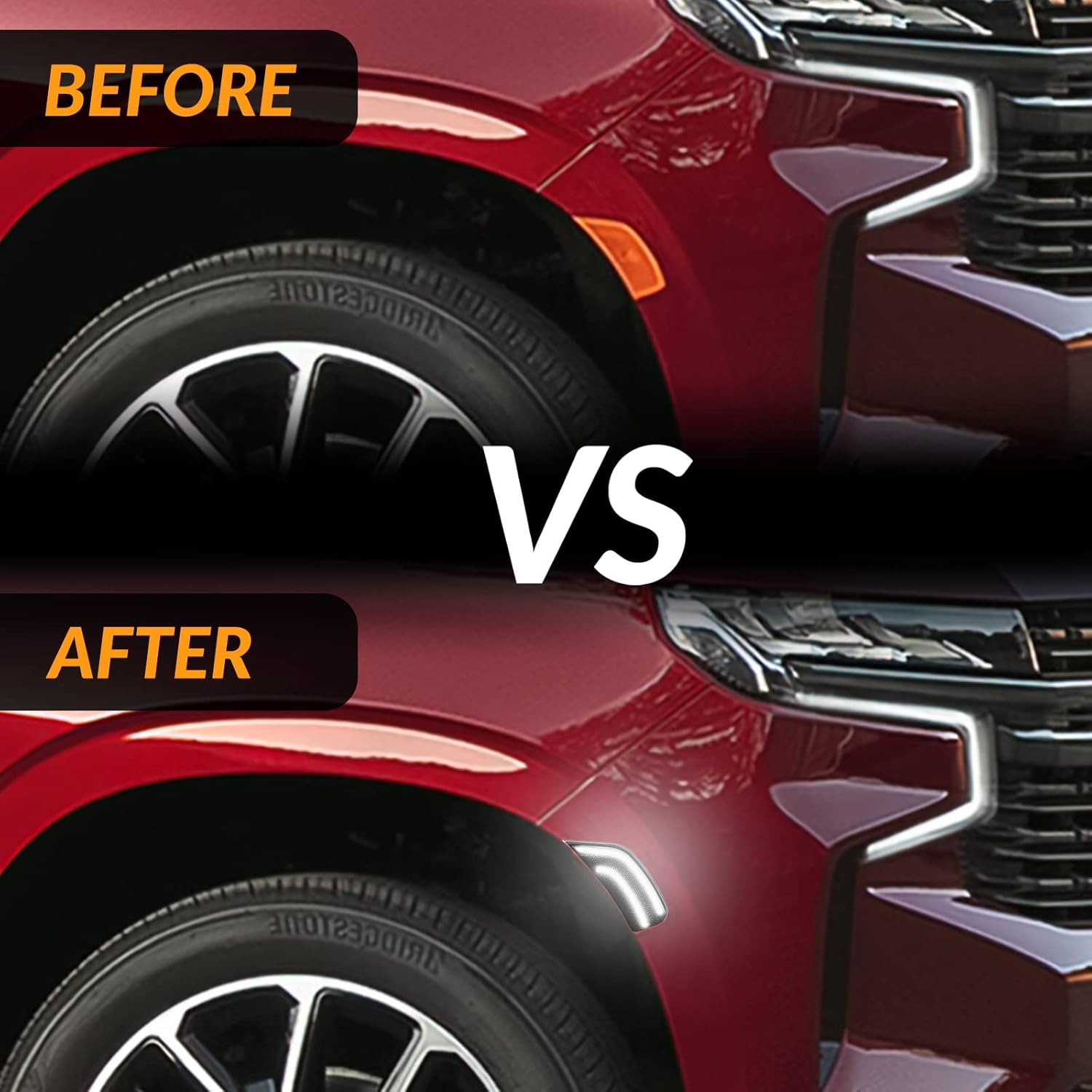 LED Side Marker Lights for 2021-2024 Yukon XL Denali Tahoe Suburban Escalade ESV White Position Signal Lamps Smoked Len, 2 Pack (WHITE LED)COMPATIBILITY:2021-2024 Chevy Suburban2021-2024 Chevy Tahoe2021-2024 GMC Yukon / Yukon XL / Yukon Denali2021-2024 Cadillac Escalade / Escalade ESVOEM Part Number: 84776453, 84776452; GM2551206, GM2550206SPECIFICATION:LED Color: WhiteLEN Color: Smoked LenHousing Color: BlackVoltage: 12VMaterial: PC lens, ABS plastic housingPlacement on Vehicle: Front Side Marker Lamp5X Brighter than OEM BulbSimple Installation, plug & play, direct-fit replacement, no modificationNon-polarity, no need to worry about negative and positive connectionsPackage: 2x Side Marker Lights(Smoked Len)