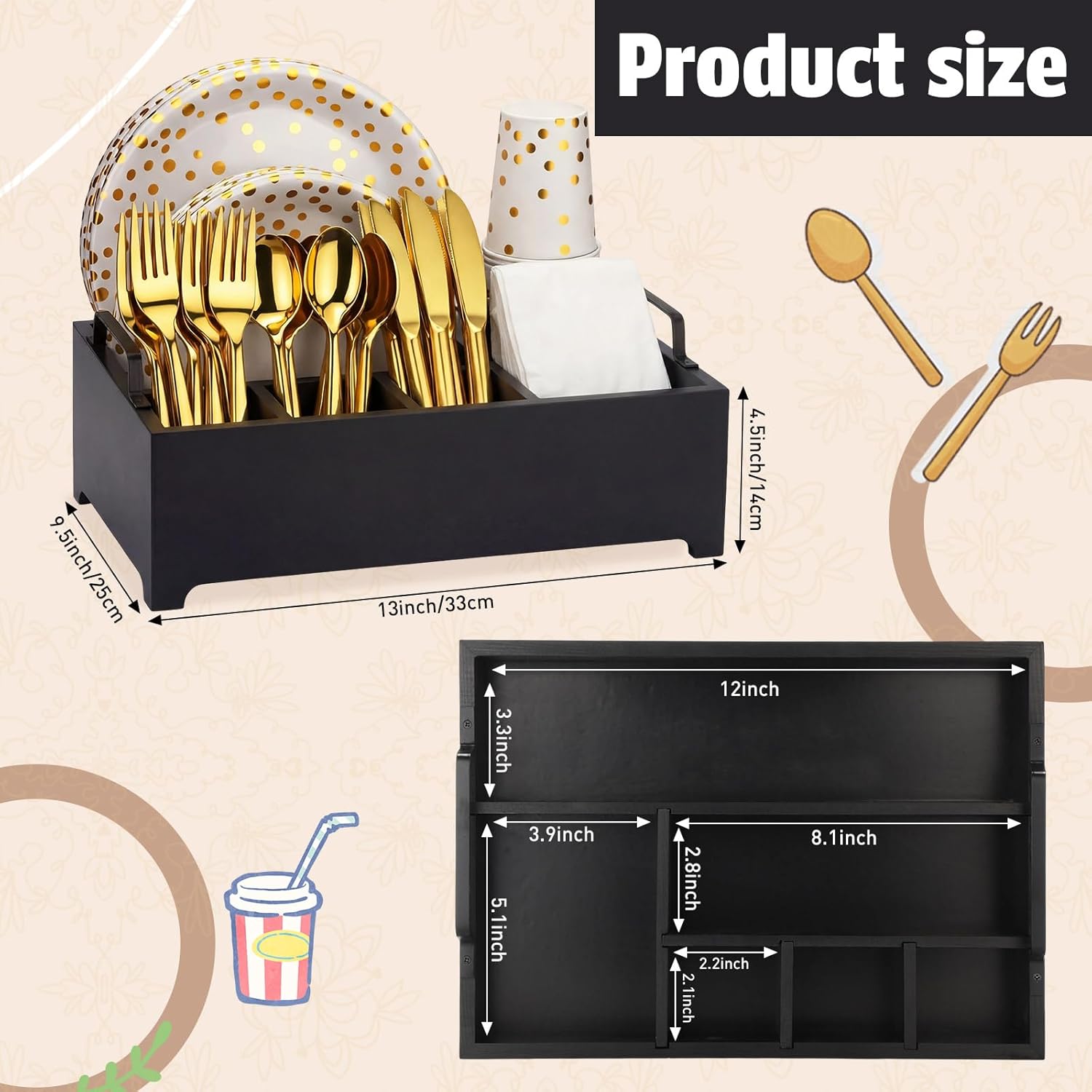 Features: Space Optimizing Vertical Design: Maximize your counter space with this vertically designed rustic utensil holder that stores everything upright rather than spreading items horizontally. The compact footprint occupies minimal surface area while providing substantial storage capacity for your dining essentials. This efficient paper plate dispenser keeps your most applied items within easy reach while maintaining a clutter free kitchen. Easy Maintenance Long Term Care: The smooth wooden surfaces of this paper plate organizer for counter allow for simple cleaning with a damp cloth when needed. The natural wood construction resists stains and odors, maintaining its fresh appearance through regular use. Specifications: Material: wood Color: black Size: 33 x 24 x 14 cm/ 12.99 x 9.45 x 5.51 inches Package includes: 1 x Paper plate dispenser Notes: Manual measurement, please allow slight errors on size. The color may exist a slight difference due to different screen displays