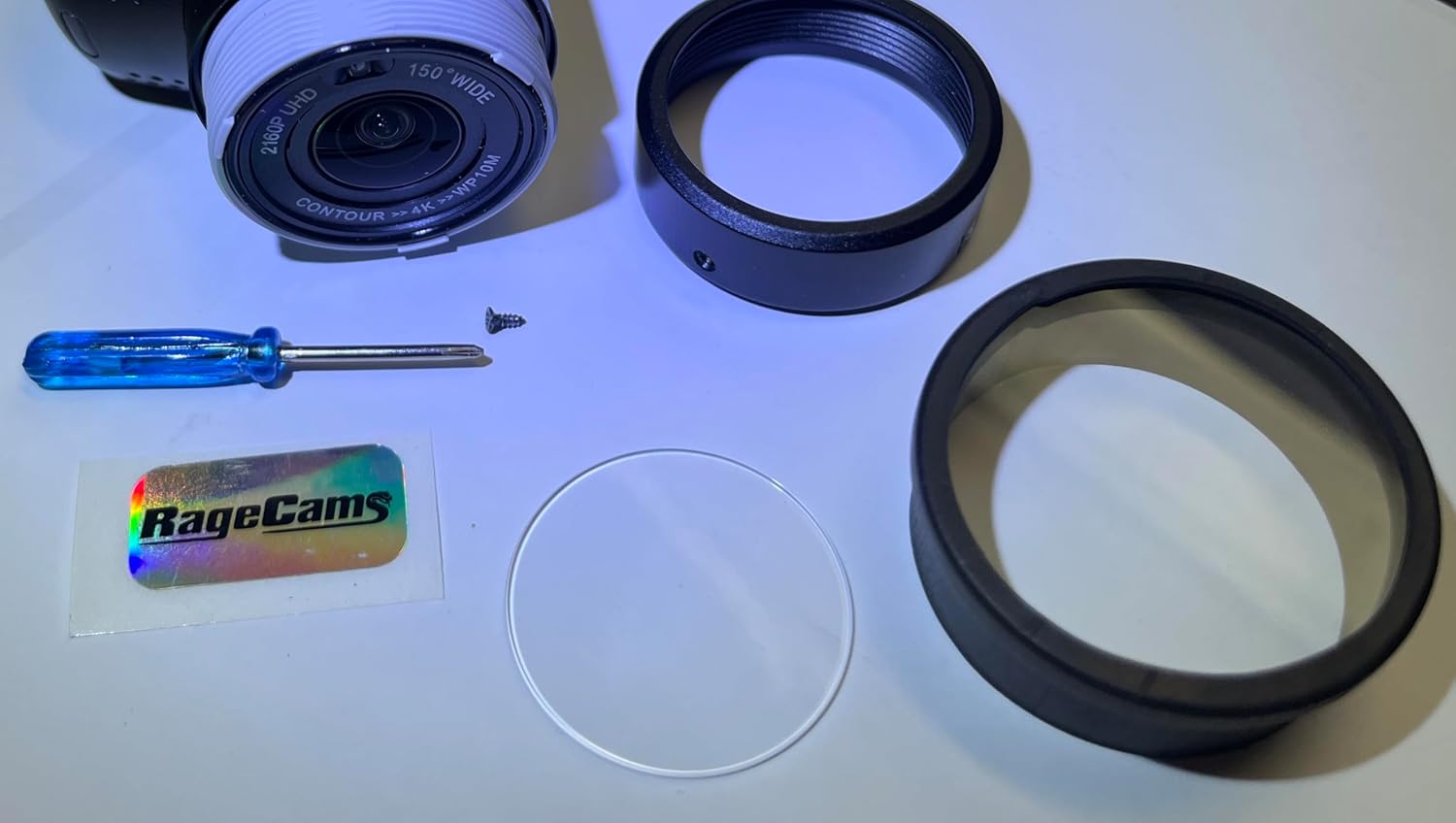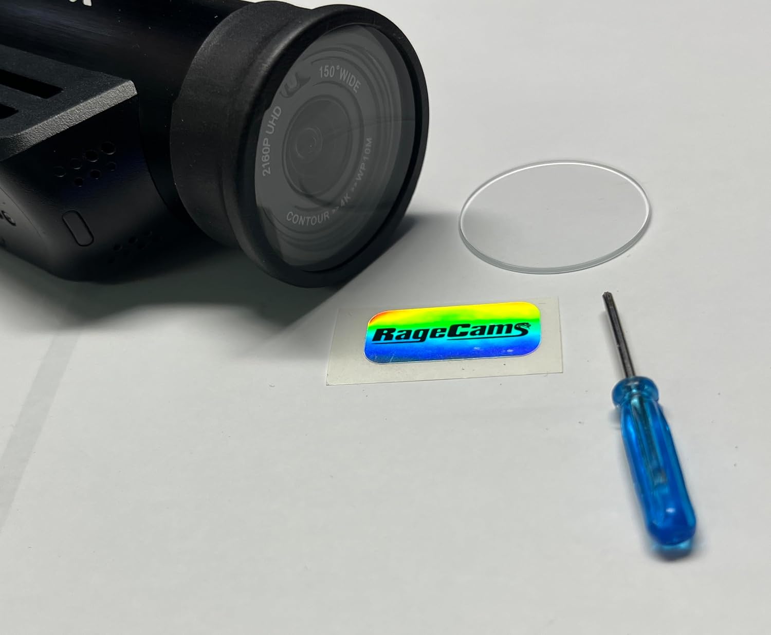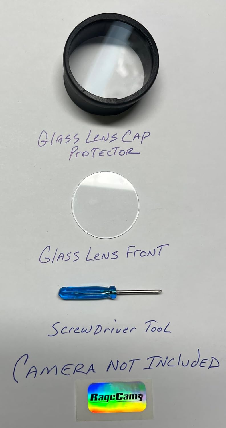 Replace your cracked or damaged front clear lens with this new RageCams lens kit & slip on the glass lens front 3mm cap to protect the camera lens. Includes screwdriver, glass lens, film through glass lens cap, & RageCams sticker pack only. Camera not included.