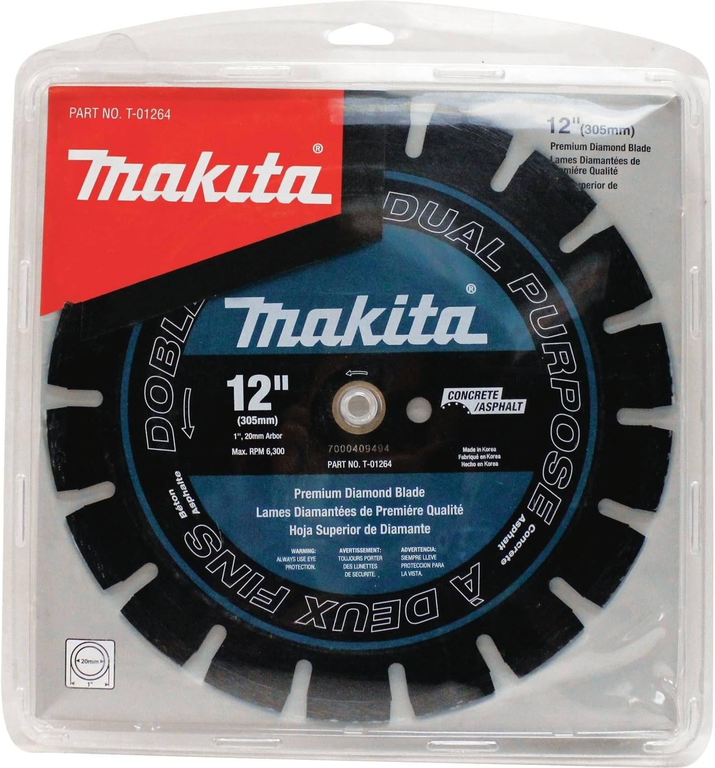 Product Description DESIGN : Laser welded to ensure the strongest joint possible DESIGN : Superior quality steel core PERFORMANCE : Optimum bond matrix provides a faster, longer, smoother diamond blade EFFICIENCY : Highest quality diamonds INCLUDES : 12" Diamond Blade, Segmented, Dual Purpose About Model Makita Diamond Blades are designed to be used with power cut saws for making concrete in a variety of masonry materials. The high quality steel core is expertly tensioned for true cuts and added durability. Each blade features the highest quality diamonds and the segments are laser welded for added durability and improved cutting efficiency. Features Laser welded to ensure the strongest joint possible Superior quality steel core Optimum bond matrix provides a faster, longer, smoother diamond blade Highest quality diamonds Expertly tensioned for true cuts Slots create significant cooling Ideal for making cuts in concrete and asphalt. Specs Blade Diameter : 12" Arbor (diamond blades) : 1", 20mm Application (diamond blades) : Asphalt, Concrete Rim Type : Segmented Tool Compatibility : Power Cutter, Cut-off Saw Shipping Weight : 4.22 lbs. UPC Code : 088381-942621 From the Manufacturer Highest quality diamonds, laser welded to ensure the strongest joint possible, slots create significant cooling for segmented blades