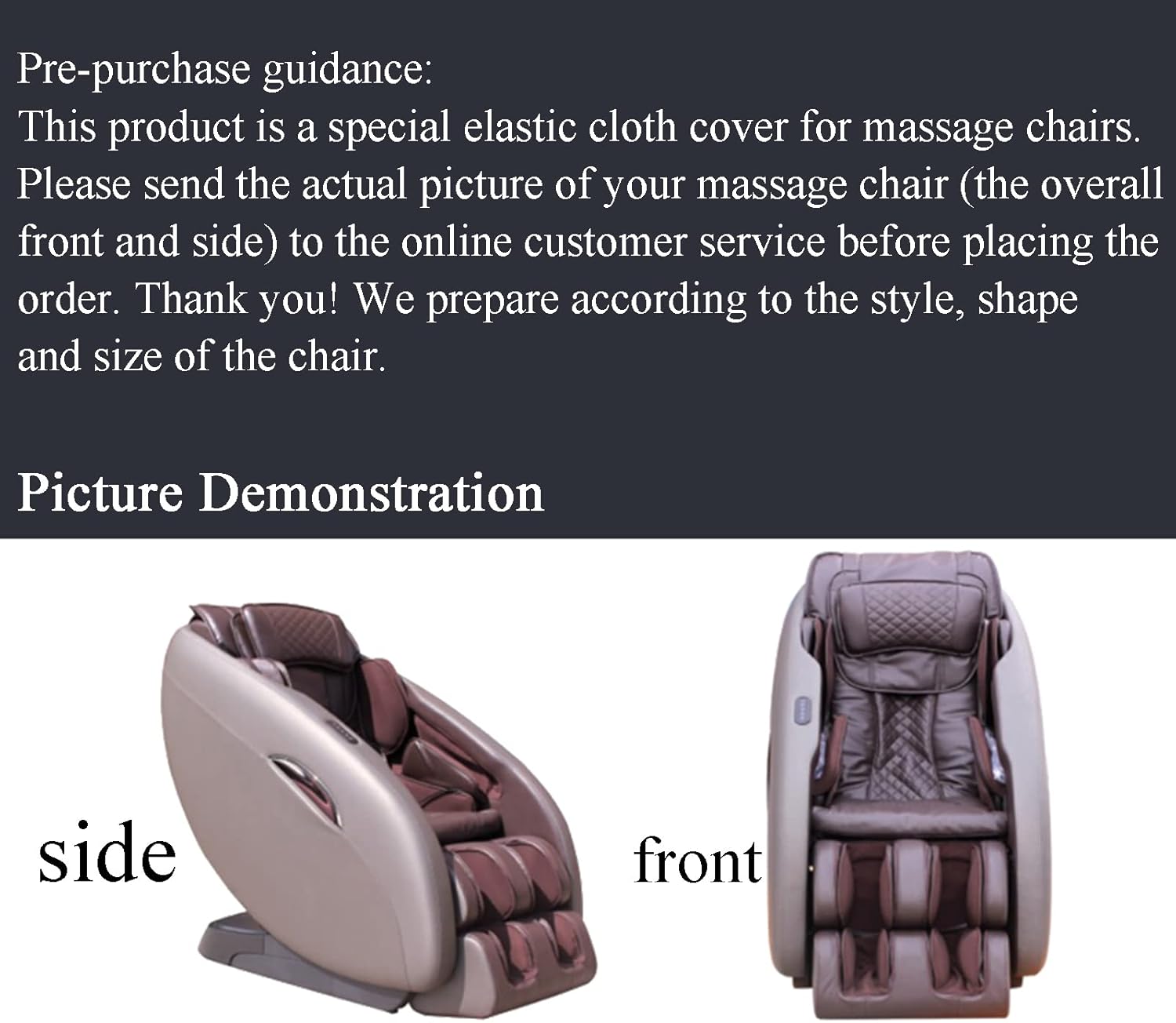1. Before taking photos, please send photos of the front and side of the massage chair (the whole picture must not be covered) to confirm the style of the massage chair.2. Different massage chairs may be matched in different ways, so you can choose to match them.Material: Wear-resistant cloth + elastic clothPurpose: Prevent dirt, damage, and hide uglinessCleaning and maintenance: hand wash, machine washIntroducing the Massage Chair Cover, a versatile and practical accessory that enhances your massage chair experience. This full-body cover serves as a dust protector and is easily removable for cleaning and maintenance. Designed to prevent pet scratches and featuring a non-slip design, this cover ensures the longevity of your massage chair. With a skin-friendly, breathable, and soft high elastic fabric, you can enjoy a luxurious and comfortable feel during your massage sessions. The convenient slip-on design allows you to use the massage chair immediately without the hassle of taking off the cover. Get the most out of your massage chair with the Massage Chair Cover – the perfect blend of protection and comfort.