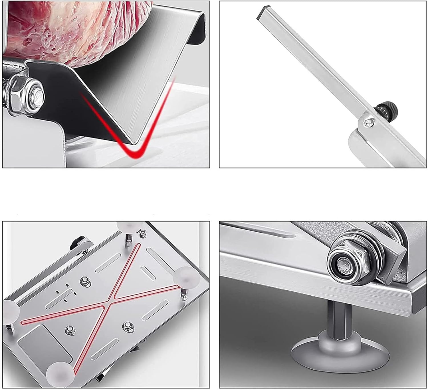 ▲ Specification:- Blade material: thickening and high quality alloy steel- Fuselage material: stainless steel- Rotation method: knob fast adjustment- Cleaning method: water washing- Size:32*15*44.5cm- Set the blade length: 170mm- Weight: 2130g▲ Features:1. Special alloy steel blade, in use.2. Stainless steel construction, solid and durable.3. Easy to clean and enable for a long time to use.4. Thickness of the slice can be manually adjusted.5. Easily slices meats, hard vegetables and fruit.6. The meat slicer can solve most of your meat roll problem.7. Make you can choose the proper slice thickness for different food.▲ Warm Reminder:1. Please keep clean after using every time to avoid rusting issues.2. The stainless steel slicer can only cut meat, hard vegetables and fruit.3. Do not put it 100% fresh meat on it, it can’t work with them.▲ Package Included:1*Meat Slicer1*Frozen meat bag1*Press plate