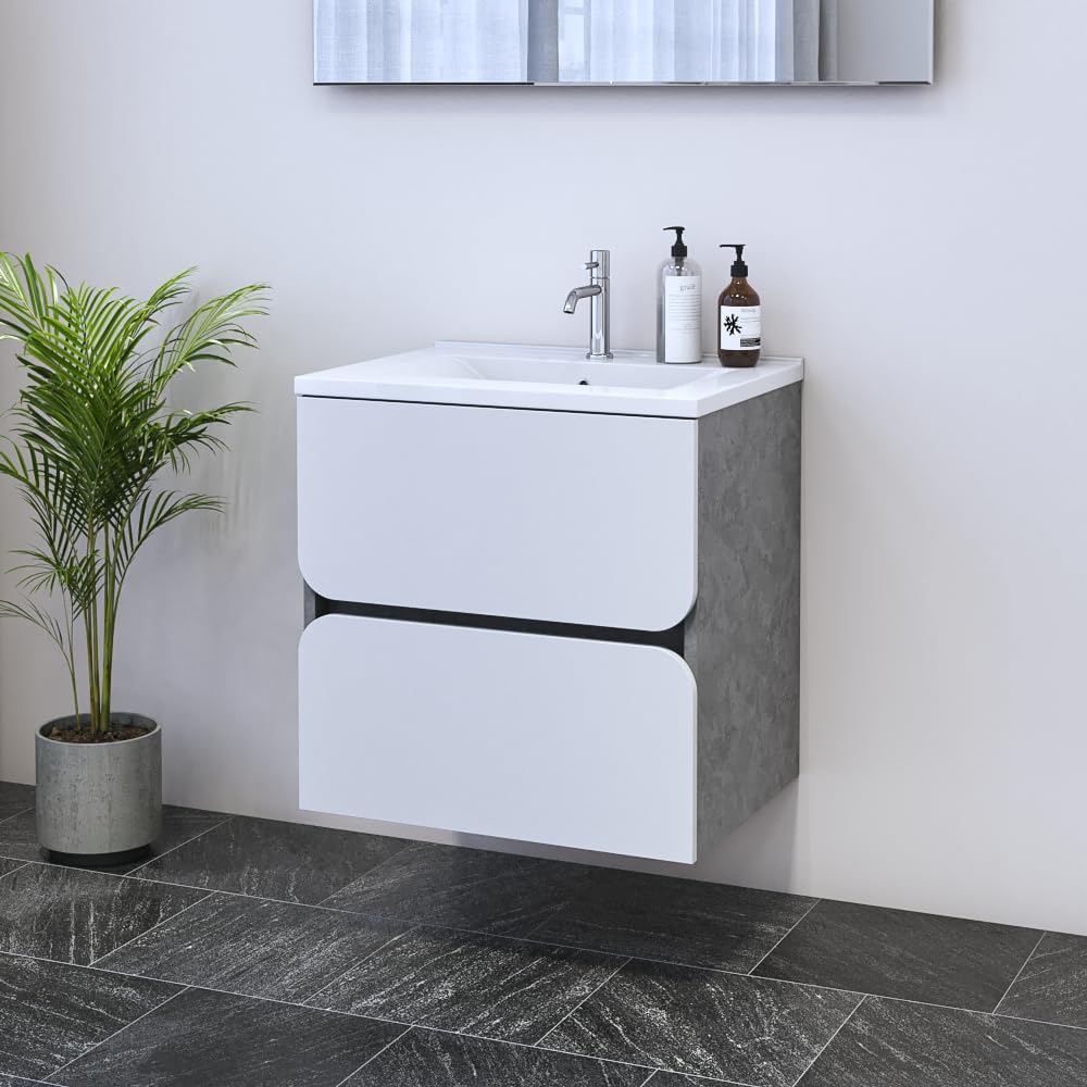 The Meble Furniture Azurro 2S 60 floating bathroom vanity combines elegant European design with practical functionality. Crafted from engineered wood, this vanity features a high gloss front with a matte body, offering a modern aesthetic that enhances any bathroom environment. Its wall-mounted design saves valuable floor space and simplifies cleaning, making it perfect for small to medium-sized bathrooms. Equipped with two spacious drawers and compartments, it provides ample storage for towels, toiletries, and other essentials, helping maintain an organized bathroom. The included 18-inch white vessel sink adds a contemporary touch while the complete mounting kit ensures easy and secure installation. This versatile vanity measures 23.6"H x 23.6"W x 18.1"D, making it an ideal choice for enhancing your living space with style and efficiency.
