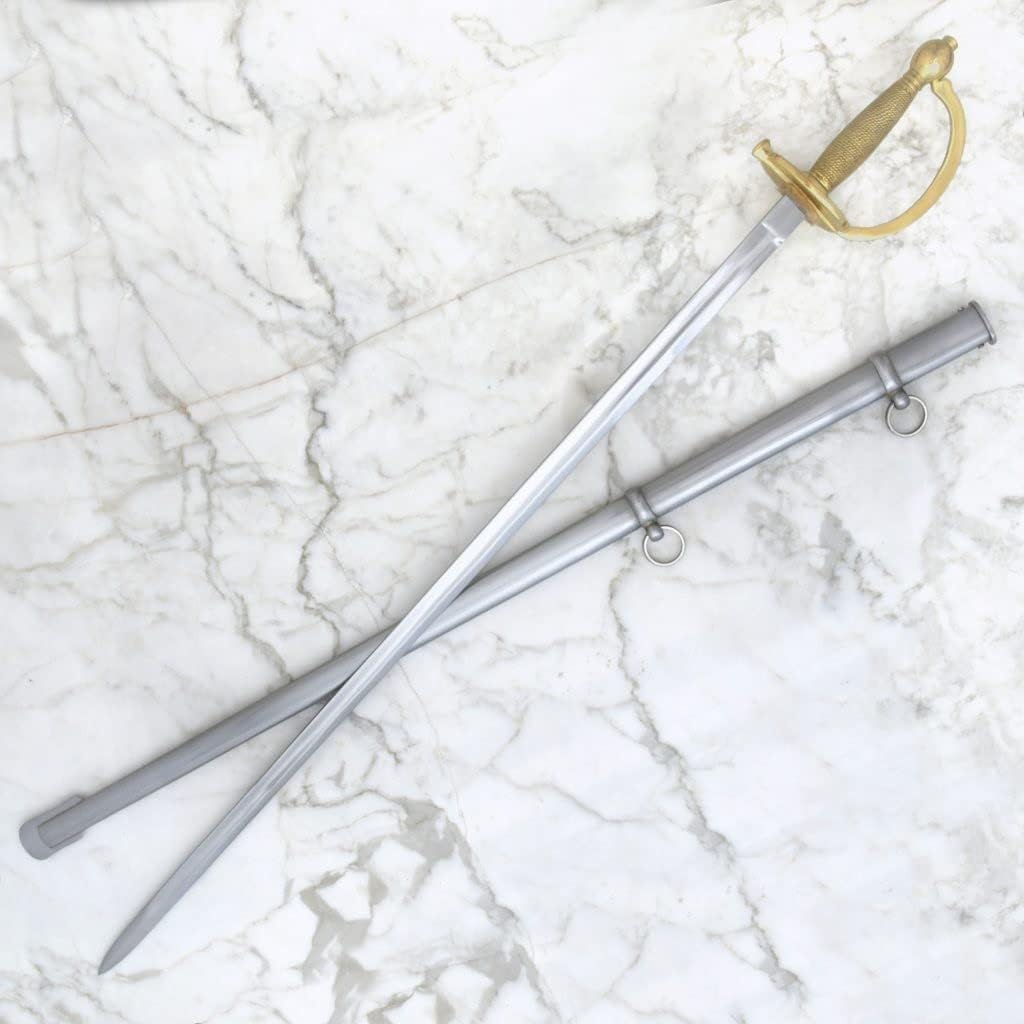 The 1840 NCO sword was carried by American soldiers for over 70 years; a period which included the Mexican War, Civil War and Spanish American War. It remained in service even during the 20th century as a ceremonial weapon. The single-edged blade has a broad fuller starting from the ricasso, and ending near the point. The entire hilt is cast brass and the grip is ribbed. Pommel is global with a capstan. Grip is flanked by kidney-shaped hand guards The 1840 NCO sword comes with a steel scabbard.