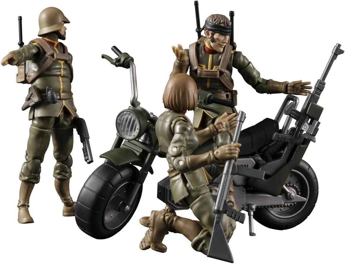 Introducing a new G.M.G (Gundam Military Generation)" set from the Ramba Ral Corps! The "08V-SP" is a precolored finished figure set of a solider and a motorcycle! The other optional head comes with a bandana-wrapped around it and parts that can reproduce the look of Zeigan from Ramba Ral's group. This set also comes with several weapons and accessories: A Navan 62 type pistol, a formal shotgun, a communication set, a harness, a pistol holder, and various replacement wrists are also included.