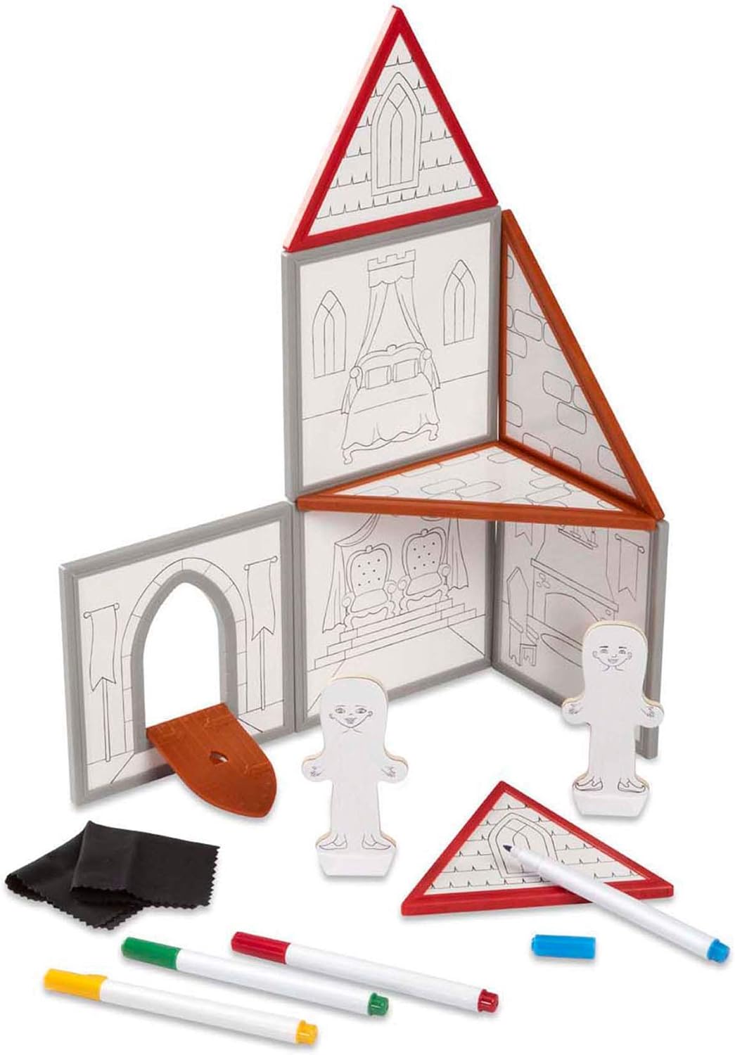 Build an imaginary Kingdom with the magnetivity magnetic building play set draw & build castle! Magnetivity encourages kids to experiment, explore, and imagine by inspiring them to design and build their own unique worlds! The 8 double-sided dry-erase panels have line art on one side and are blank on the other, so kids can use the four included dry-erase markers to create and color scenes. Color in the two wooden play figures in stands, too. Use the cloth to erase and draw again! These unique panels magnetically attach in different combinations, so kids can draw on and build new designs for their castle every time they play. Great for open-ended, hands-on exploration and play! All magnetivity panels are compatible. (All panels magnetically attach, but magnetic accessories from other magnetivity sets do not stick to draw & build panels.) pediatricians say building and rebuilding provide lessons in resilience. Assembling parts, as kids do with these magnetivity kits, can also promote visual-spatial awareness. Magnetivity makes a great gift for 4-year-olds, 5-year-olds, 6-year-olds, and up. Even many 10-year-olds will enjoy building and creating with magnetivity.for more than 30 years, Melissa & Doug has created beautifully-designed imagination- and creativity-sparking products that NBC news called “the gold standard in early childhood play.” we design every toy to the highest-quality standards, and to nurture minds and hearts. If your child is not inspired, give us a call and we'll make it right. Our phone number is on every product!