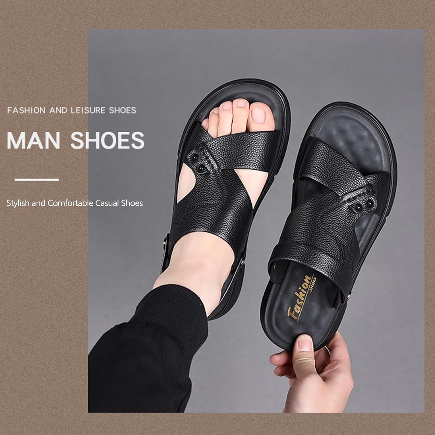 Men's Sandal and SlipperIt's a versatile men's casual sandal suitable for hiking,walking,driving car,outdoor working,camping,travel,vacation,walking the dog and so on.It's a really attractive design .With the dark leather skin and the simple stitch,It special go with jeans or slacks. The outsole gives it a modern and even a bit of a sporty feel .A blend of stylish sandal with some sneaker bottoms,comfortable and feel sturdy.High Quality LeatherSandals for men leather use high-quality first layer cowhide, matching with elastic fabric materials, which is breathable and skin-friendly. In addition, these sandals are water-resistant, so they’re suitable for use with water sports.Adjustable StrapThese Sandals for men leather can be easily converted between sandals and slippers according to your preference and occasion.There sandals have With rotatable heel strap on the side and ankle. It is easy to slip on and take off.Tracked Non-Slip SoleBend arbitrarily according to walking habits, and the crawler-type antislip pattern partitions to enhance anti-slip.These Men's Sandal and Slippers are perfect for:*Hiking*Travel*Leisure time with family ,friends or only yourself*Wonderful time with your other family members such as play games with dog.*Daily walking*Gift,such as Christmas gift for your friends!