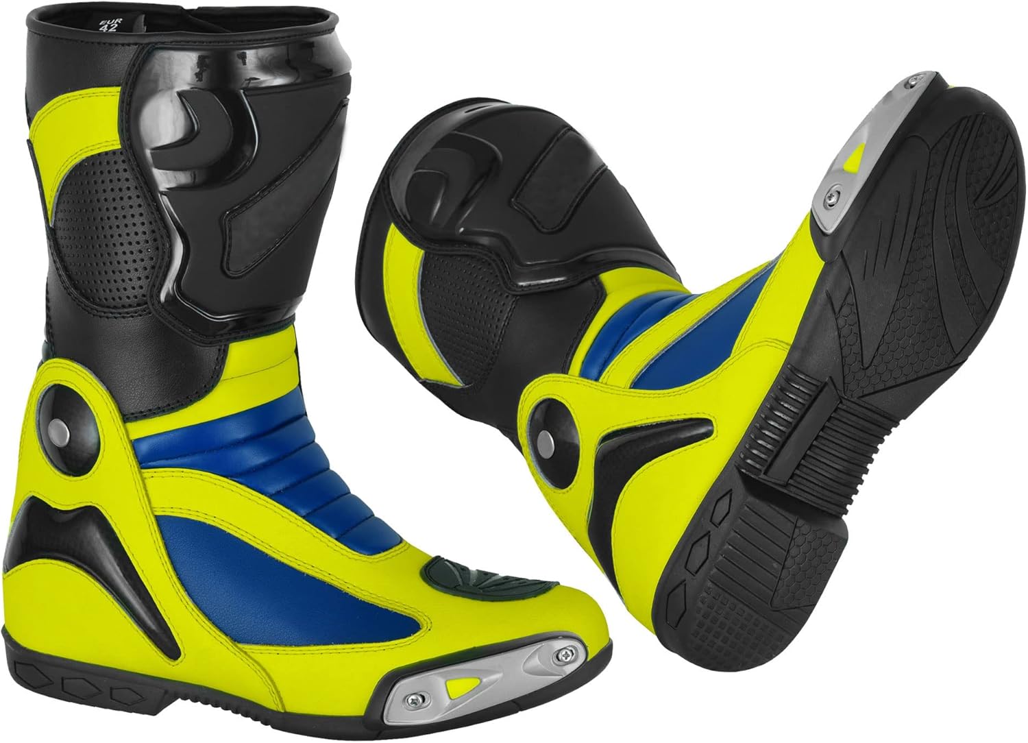 Pro Racing Motocross Boots for Men - Competition Motorcycle Boots with Secure Closure & Non-Slip SoleBuilt for Track Performance: Engineered specifically for motocross and supercross racing, offering superior control, flexibility, and responsiveness during high-speed rides.Advanced Protective Design: Reinforced shifter plates, ankle support, and shock-absorbing heel cups provide critical impact and abrasion resistance in competitive environments.Secure Racing Closure System: Features a strong, adjustable closure designed for a locked-in fit that stays secure during aggressive riding and impacts.Premium Genuine Leather Construction: High-quality leather ensures long-lasting durability and rugged performance under extreme riding conditions.High-Grip Racing Sole: Durable non-slip rubber sole with an aggressive tread pattern maximizes traction on footpegs and in muddy, uneven terrain.
