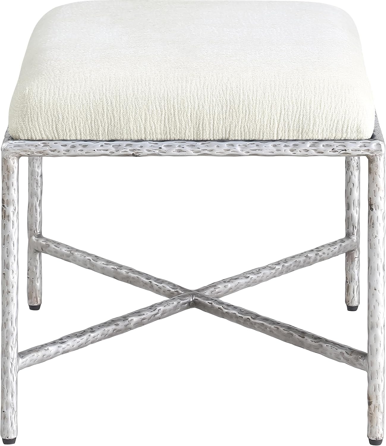 Introducing the Valley cream chenille fabric upholstered bench, bringing a touch of understated luxury with its soft fabric and sculptural form. Supported by a sleek brushed silver forged iron frame, this bench strikes the perfect balance between warmth and modern elegance. Its contemporary design makes it a versatile piece, whether styled at the foot of a bed, in an entryway, or as additional seating in a living space.