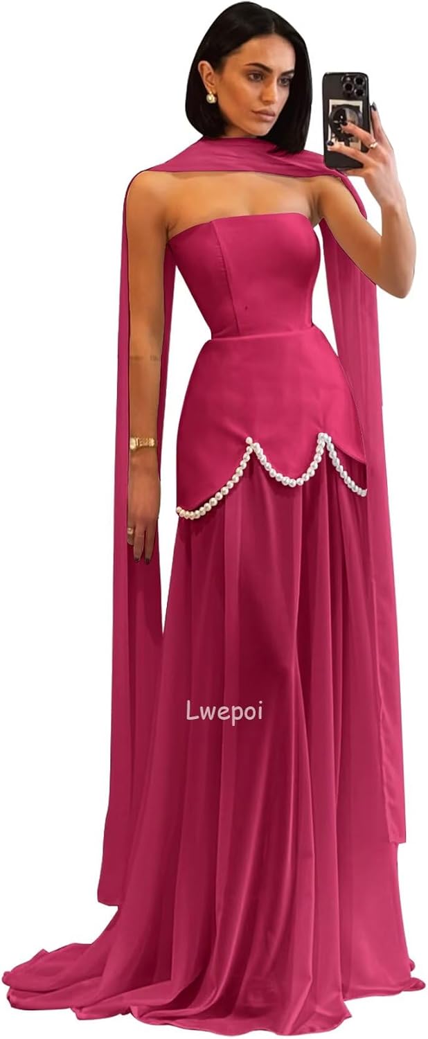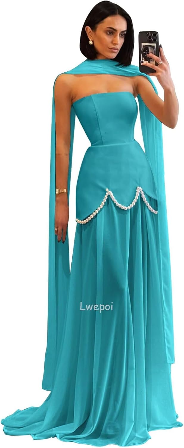 • Features:Mermaid Prom Dresses for Women Chiffon Strapless Formal Dress with Cape Pearls