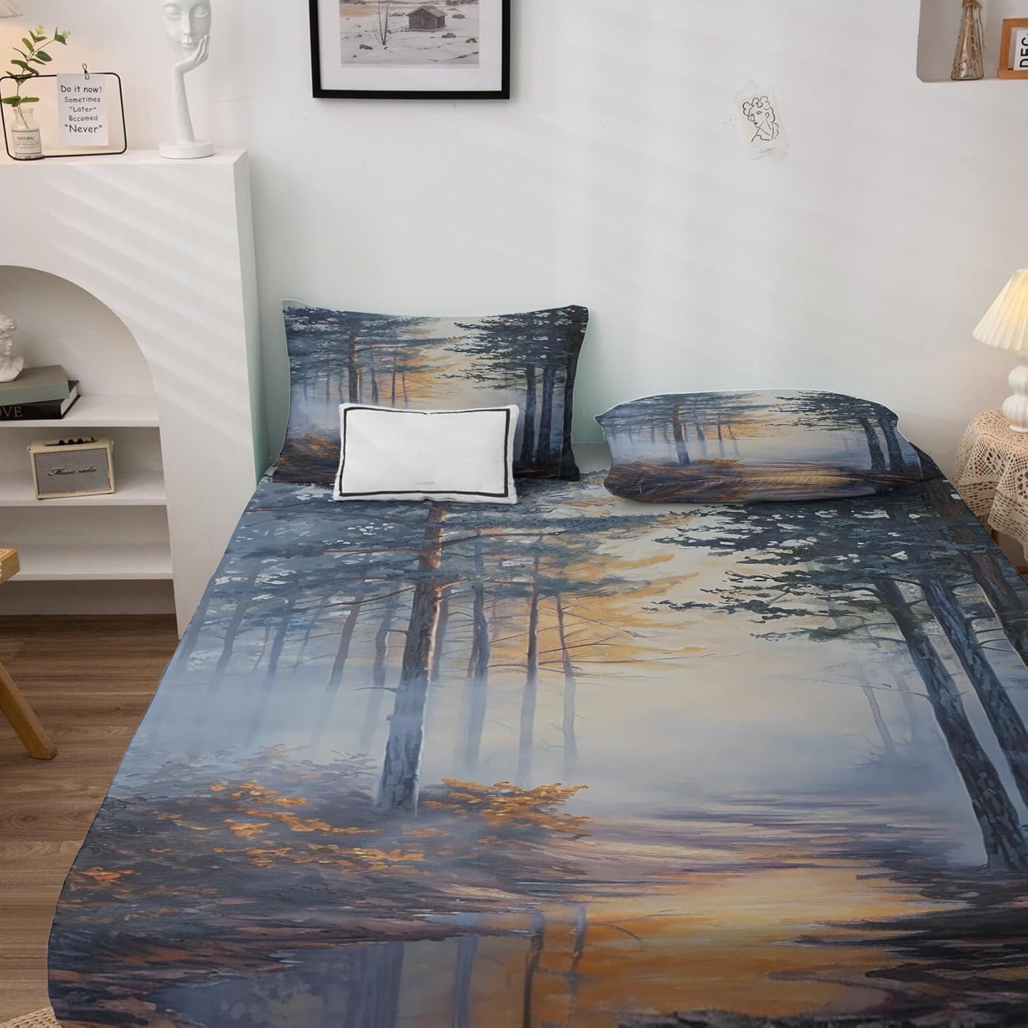 Misty Forest Bedroom Decorations & Room Essentials ⭐Premium Material Our bed sheet set is made of 100 percent micro fiber. Ultra soft, silky, lightweight, breathable and high thread count The choice of good quality fabric ensure it anti pilling, no wrinkle, sweat and fade resistant. Also, they are softer and smoother than organic cotton and egyptian cotton bedsheet ⭐Perfect Size Queen size bed sheets 4pcs set: 1 flat sheet 90 x 102 inch, 1 fitted sheet 60 x 80 x 16 inch, and 2 standard pillow cases 20 x 26 inch ⭐Decorative Sheet Set Personalized pattern can perfectly decorate your room, bedroom, guest room, RV, kids room, boys room, girls room and make it look vibrant ⭐Ideal Gift This bedding sheets & pillowcases come with a unique pattern design, perfect as a birthday and festival gift for family and friends ⭐Well Made Our sheets feature neat and strong stitching for better strength. Reversible pillow shams with zipper closure, easier to insert and remove the pillow than the button pillowcase ⭐Pet Hair Resistant Don't worry about pet hair anymore, this sheetset won't attract cat or dog hair and you can play with your pet anytime ⭐Suitable for All Seasons Our sheet & pillowcase sets are suitable for spring, summer, fall and winter The smooth feel of the sheet is very cozy which keeps you cool during summer and warm during winter. Hot sleepers can also use with confidence and no sweat ⭐Customer Service If you have any questions about our products, please feel free to contact us, we are happy to serve you