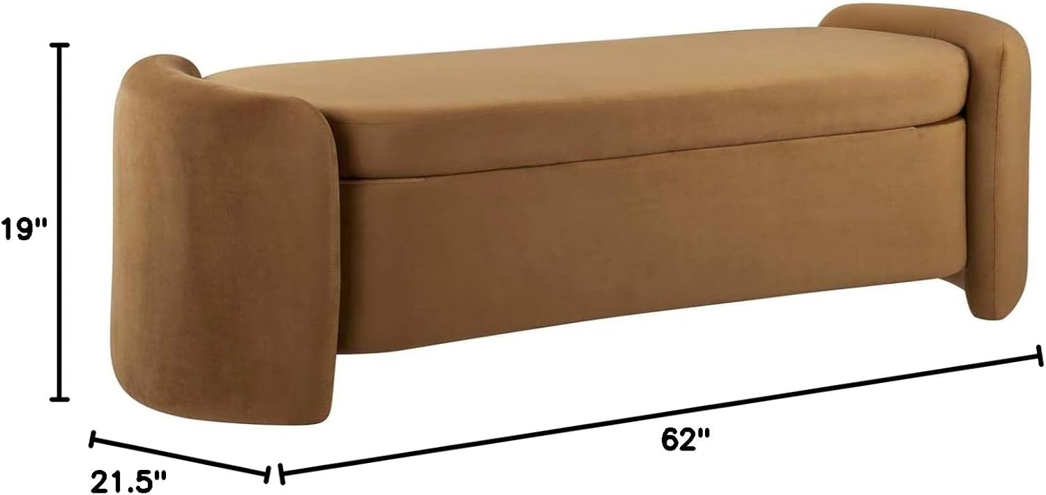 Relax amidst trending style and modern comfort with the Nebula Performance Velvet Upholstered Accent Bench. Bringing appreciated texture to your living space, entryway, bedroom, office, or other seating area, this accent bench is upholstered in a beautiful stain-resistant performance velvet fabric. Dense foam padding offers a premium seating experience and is perfect for kicking up your feet and relaxing. This storage bench has a hinged seat that opens to an 80º angle to reveal the spacious storage area perfect for hiding TV remotes, an extra blanket, magazines, books, and more.Features:- Materials: Stain-resistant performance velvet- Finish: Cognac- 80º Hinged Seat- Dense Foam PaddingSpecifications:- Product Dimensions: 19"H x 62"W x 21.5"D- Product Weight: 75 lbs- Weight Capacity: (Bench) 400 lbs