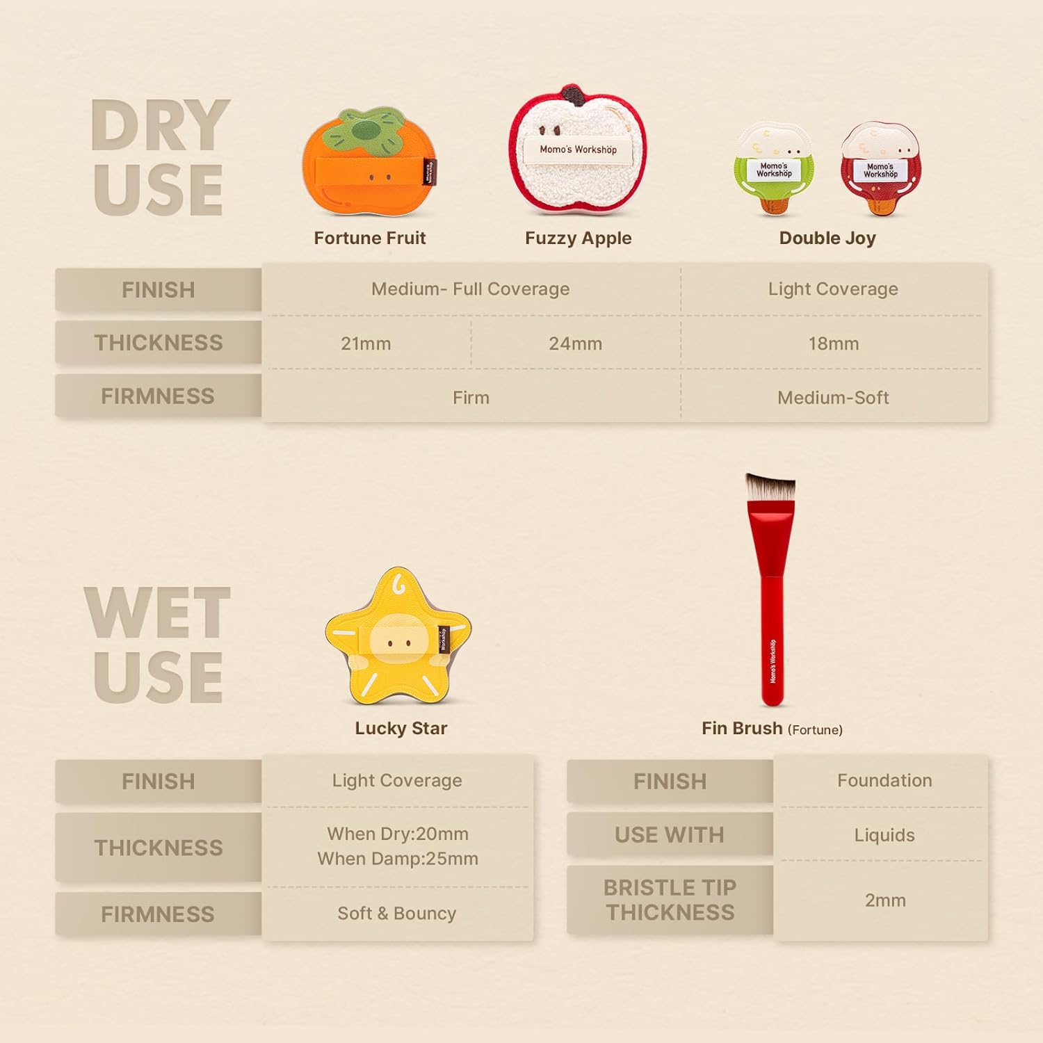 | Recommended Uses For Product | For Full Coverage: Use the Persimmon or Candy sponges DRY with liquid foundation. For a Natural Glow: Use the Apple sponge DRY or the damp Star Fruit sponge with cream products. For Smooth Blending: Use the brush in circular motions with liquid foundation. Clean tools regularly with mild soap. |