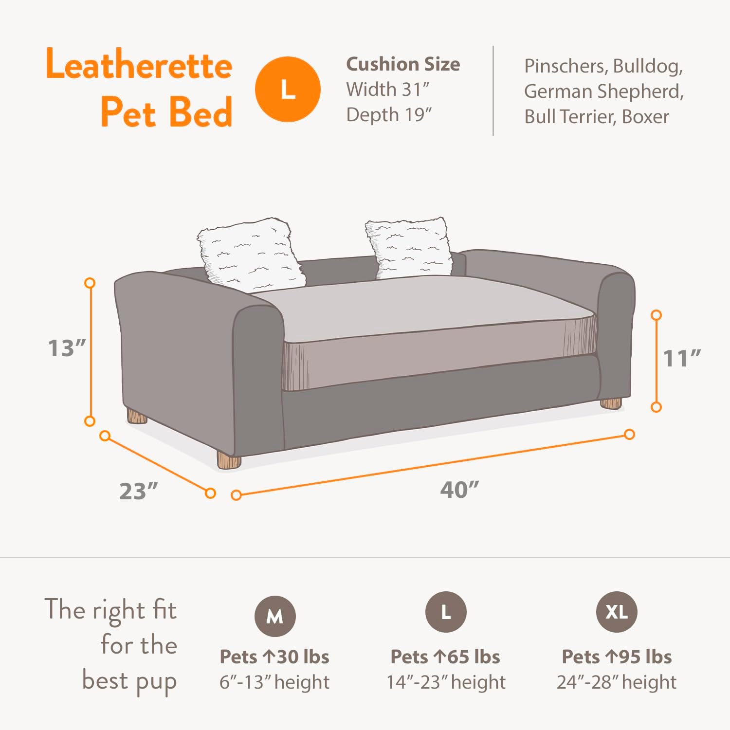 Give your pet the gift of luxury and comfort with the Moots Personalized Premium Leatherette Dog Sofa. Designed in California and made in Tijuana, Mexico, this premium couch for dog is thoughtfully crafted to provide long-lasting comfort, durability, and style. Its faux leather upholstery, reinforced with mesh fabric, offers a sophisticated look while ensuring easy maintenance. Dirt and spots are easily cleaned with just a damp cloth, so your dog's favorite spot stays fresh and cozy. Add a personal touch by customizing this pet sofa couch with your furry friend's name, with up to 12 characters, and selecting from 2 font styles. We’ve incorporated a heavy-duty zipper with locking sliders to keep playful dogs from tampering with the cushion cover. Beneath the upholstery lies a waterproof layer to protect the filling, ensuring the pet sofa bed couch remains in great shape even during accidents or spills. Inside, Moots' supreme fill formula combines poly-fiber and shredded memory foam, providing your dog with the perfect mix of support and softness. The solid wood frame and legs not only enhance the dog bed sofa durability but also add a touch of elegance to your home. Whether it’s naptime or playtime, your furry friend will love lounging on this beautifully crafted fancy dog bed, and you’ll love how it looks in your living space.