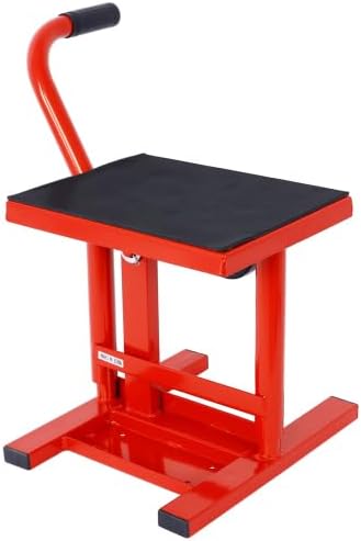 Product FeaturesSuperior Stability: The adjustable height of 11"-16.5" ensures precise leveling for stable maintenance, compatible with various motorcycle models, and convenient storage due to its compact size.Built to Last: Constructed with heavy-duty steel, our motorcycle jack stand provides durable and robust support, with a powder-coated surface treatment enhancing rust resistance for long-term reliabilityEnhanced Maintenance: Offering high-performance support, this jack stand facilitates various maintenance tasks such as oil changes, tire inspections, and chain adjustments, ensuring a safer and more efficient process.Safety First: Prioritizing safety during maintenance, our jack stand helps prevent accidental falls and allows better access to different parts of the motorcycle, minimizing risks and ensuring peace of mind.Complete Package: Each set includes 1 X Motorcycle Jack Stand and assembly drawing, with a load capacity of 330 LBS and a striking red color for easy visibility and safety. No mounting accessories are included.