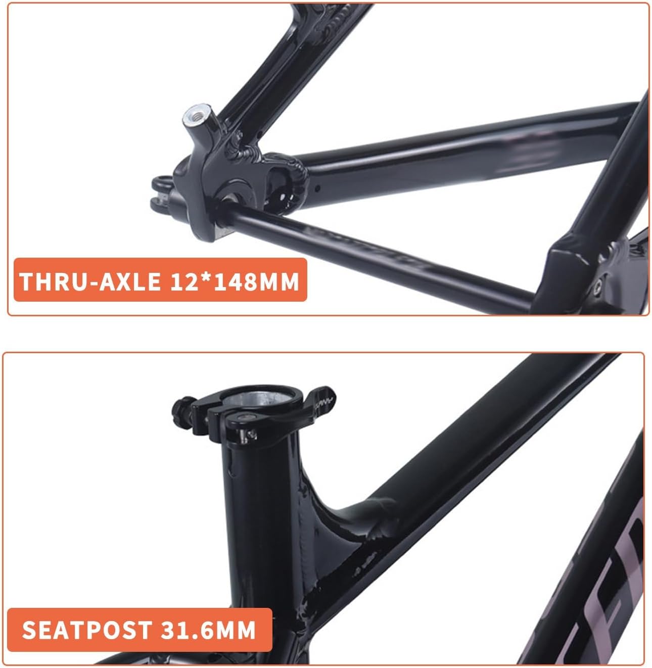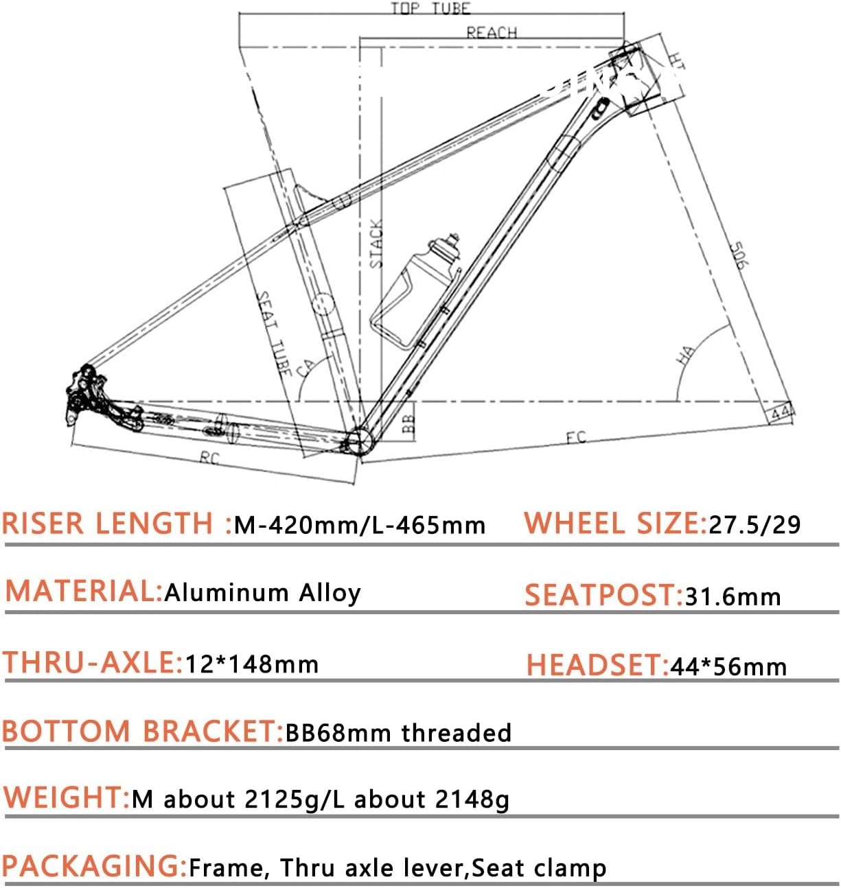 27.5/29er Mountain Bike Frame Aluminium Alloy Frames Disc Brake Thru Axle 12*148mmName :Bicycles FrameRiser length :M-420mm/L-465mmWheel Size:27.5/29Material:Aluminum Alloy Cable: internal routingColor: Black , Blue , Gray , WhiteSeatpost:31.6mmThru-Axle:12*148mmHeadset:44*56mmBottom Bracket:BB68mm threadedWeight:M about 2125g/L about 2148gPackaging:Frame, Thru axle lever,Seat clampNote: Please check if the size of bike frame is correct before purchasing.