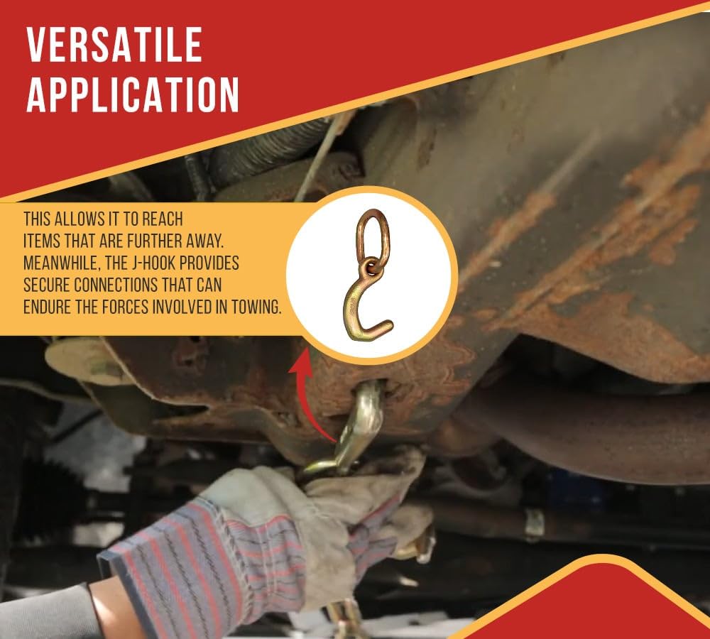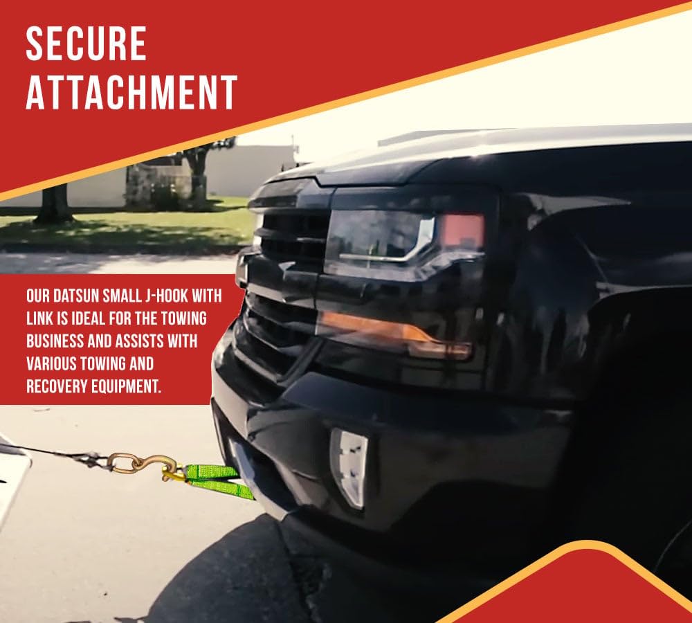 Pack Size: 4 PackFacilitate secure attachment of straps and chains to the vehicle with our Datsun Mini J-Hook that comes with an extra link. Whether you want to secure lightweight items or tow a vehicle, it’s possible with our hook. Connect it to the anchor points and reduce the risk of detachment and loosening. Learn more about what we’re offering.Size & Strength: The size of the Datsun mini J-hook is 5/16" with a Working Load Limit of 3,666 lbs and Breaking strength of 11,000 lbs. It’s engineered from steel of G70 for its exceptional strength and high load-bearing capacity. We’ve attached a link to the hook to provide versatility in various applications. Durable: The hook and the link are galvanized with zinc coating. It acts as a barrier and protects it from various environmental and corrosive elements. It’s best suited for outdoor applications and extends the life of our product.Tough & Abrasion Resistance: You don’t have to worry about wear and tear as the hook and rings are made of steel. The coating further ensures minimal maintenance over its lifetime and reduces frequent replacements.Versatile Application: The extra links are made of steel material, and galvanized for an added layer of protection. It is valuable in situations where access is limited—while enabling it to reach objects that are further away. Meanwhile, the J-hook provides reliable connections designed to withstand forces involved in towing.Secure Attachment: Our Datsun mini J-hook with link is perfect for the towing industry and helps in various towing and recovery equipment. It offers secure attachment to various vehicle parts, including frame, axle, and other sturdy anchor points.