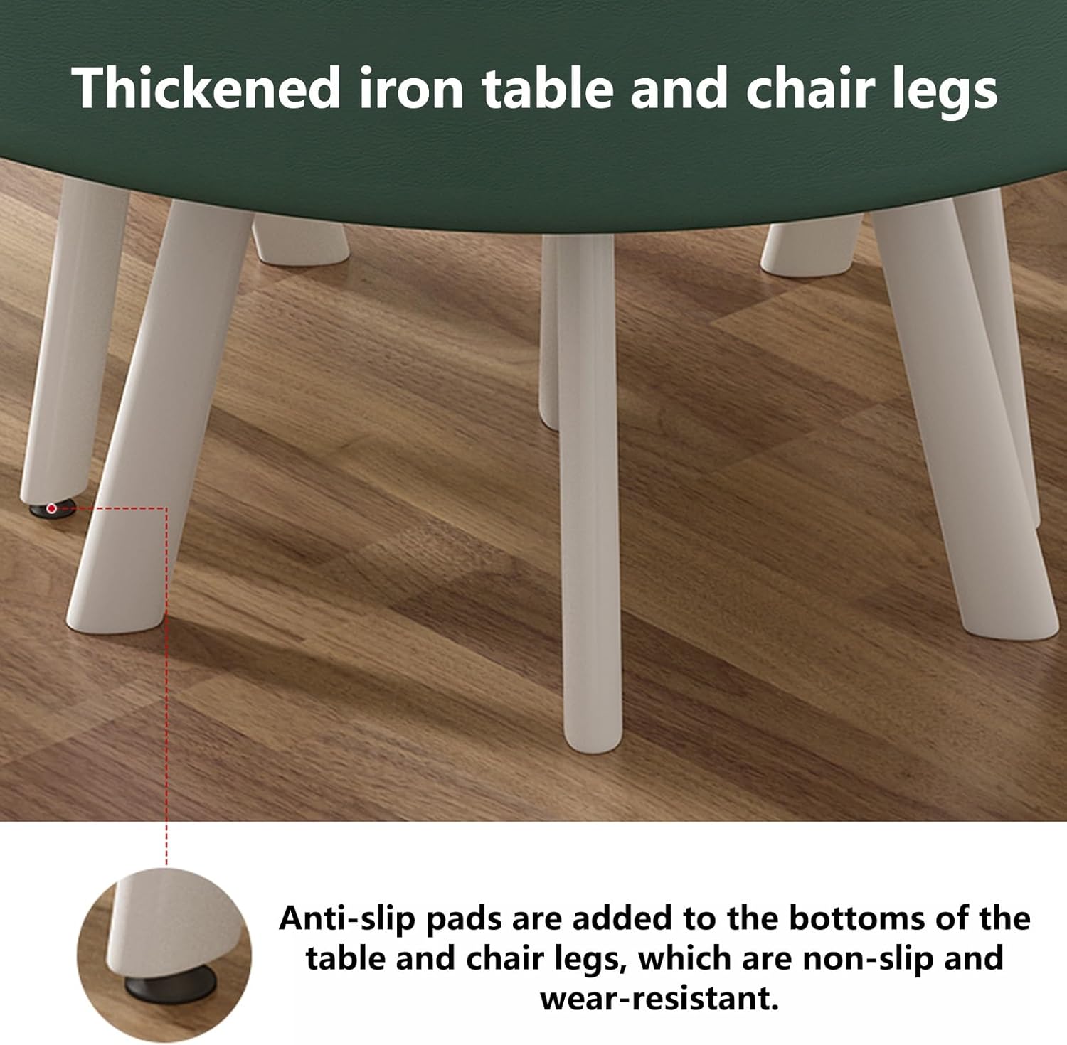 • Round table design - Supported by a four-corner frame structure, the table legs are made of high-quality iron, high-temperature baking paint, and matte craftsmanship, which will not rust or age. The rounded corners on the table prevent collisions. Keep your family safe.Table and chair set can be stored, covers an area of about 1 square meters, saving space