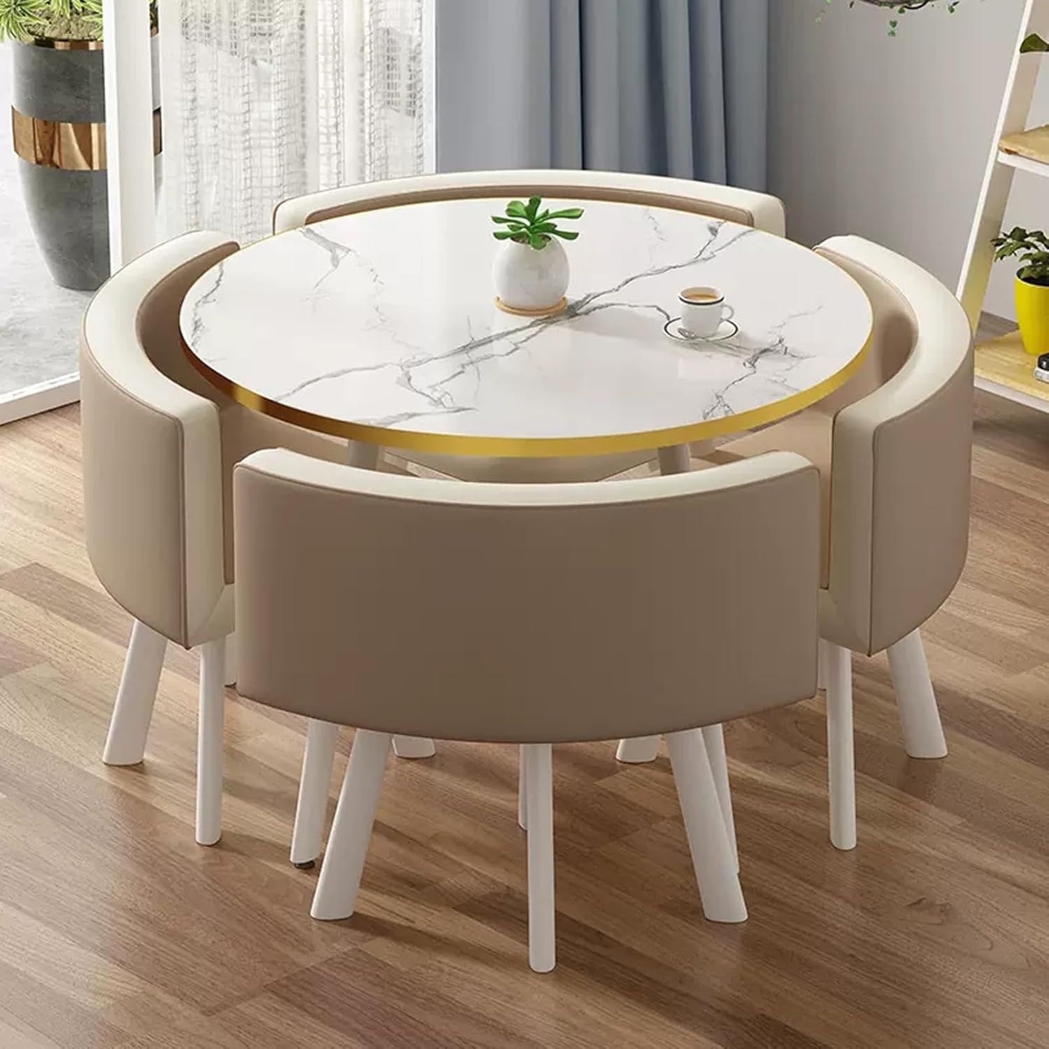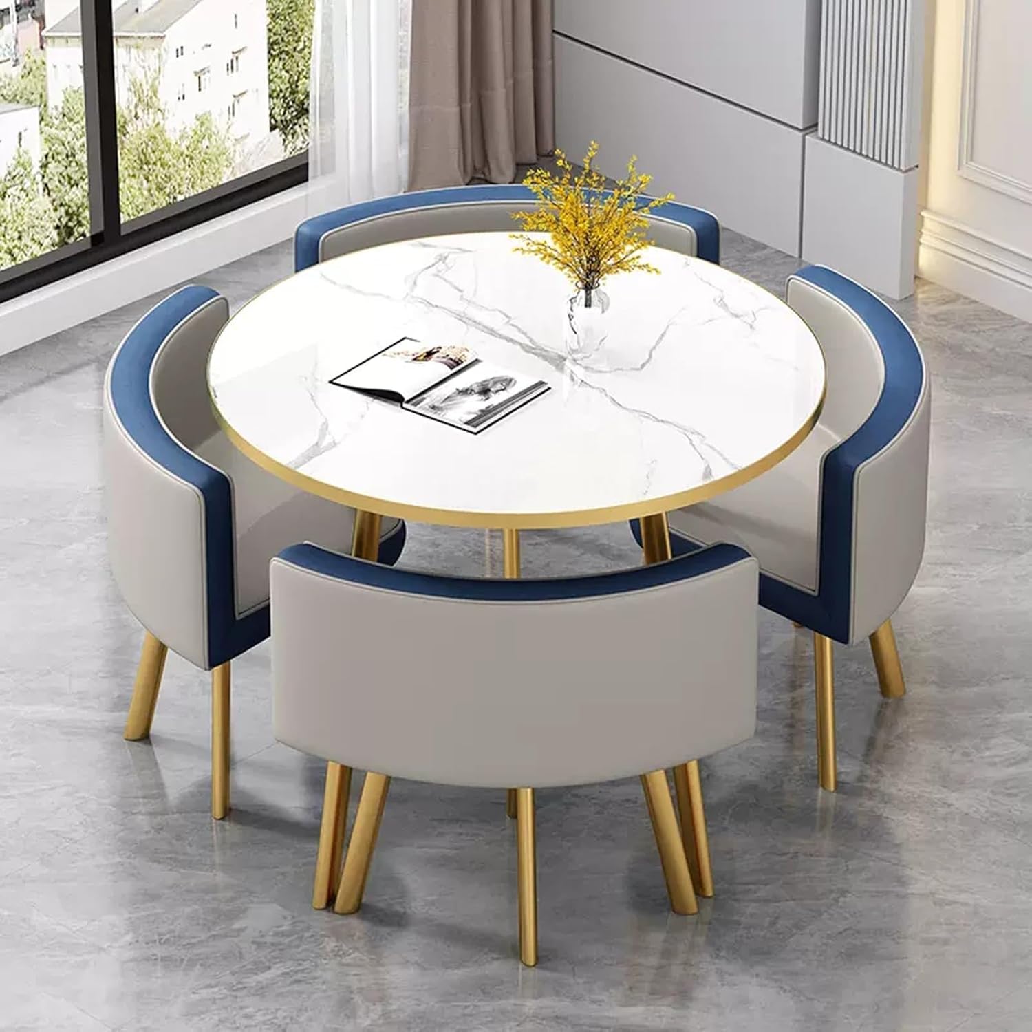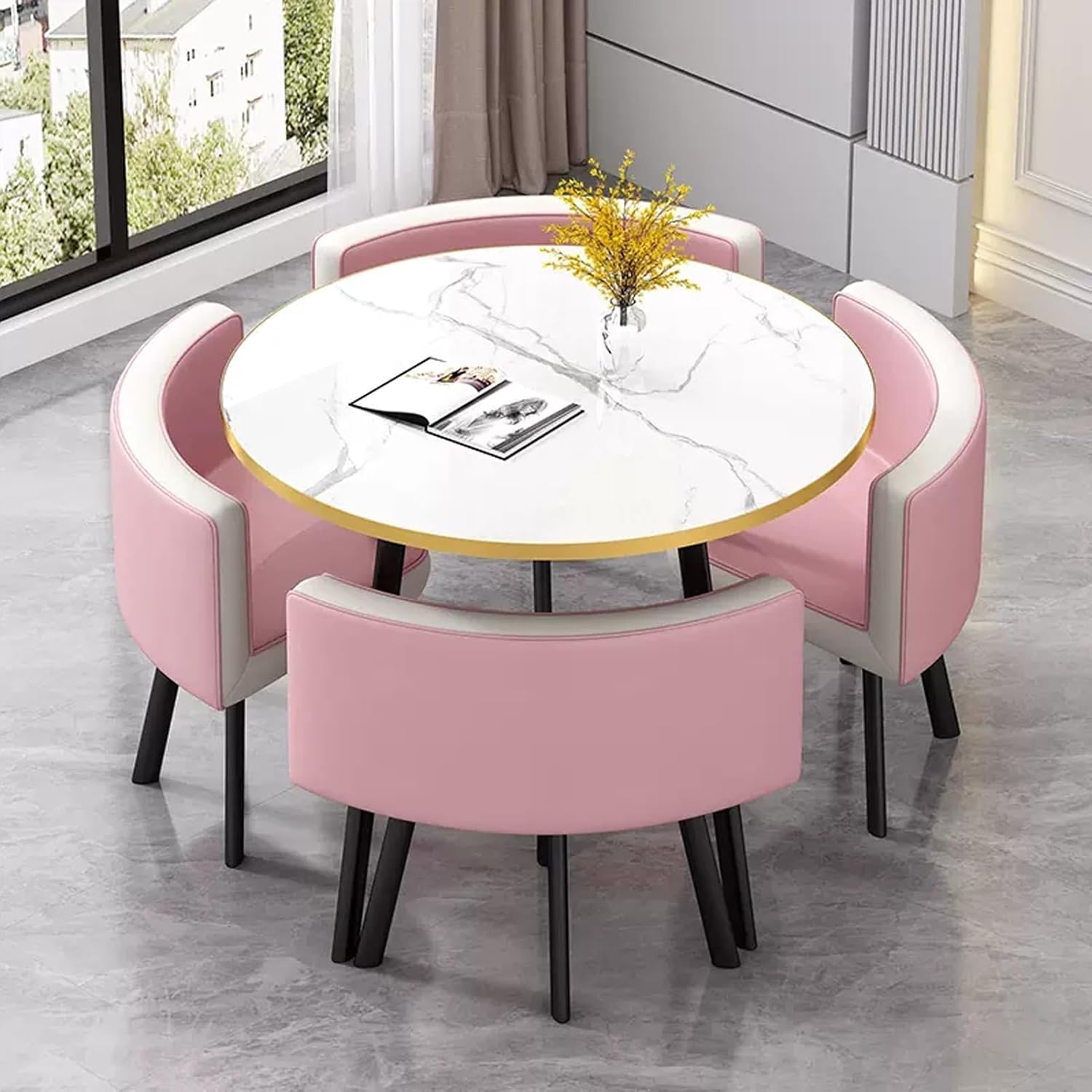 The table's contemporary design will look fantastic anywhere you choose to place it in the home, whether that be as a side table in the lounge or as a breakfast table in the kitchen. The perfect partner for the table is the Fabric Chair. This means it is sizeable enough without being obtrusive. You will be able to comfortably accommodate this round table in any room, even if space is tight.Product Parameters:Product Name: Table and chair combinationFeatures: Simple,generous,space savingColor: Reference pictureStyle: simple and modernBracket structure Material:MetallTable Shape: RoundDesk top Material:marble-likeTable top diameter: 80cm/31in,Table top thickness: 25mm /1inTable loading :300KGChairs material:PU leather,Total chair height: 70cm/27.6in,Seat height: 43cm/16.9inch,Seat loading: 100KGApplicable number: 4 peoplePacking method: assemblyPacking list:1*table,4*chairsWarm Tips:1. Size Description: The product is completely measured by hand and may have an error of 1-3 cm. Please refer to the actual items received.2. Picture description: The product is real. Due to problems with light, angle, display, etc., there may be slight chromatic aberration, please forgive me.