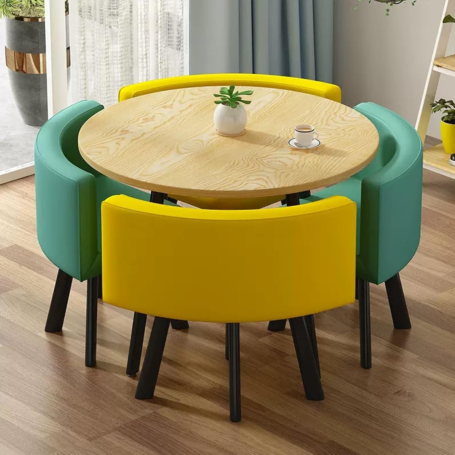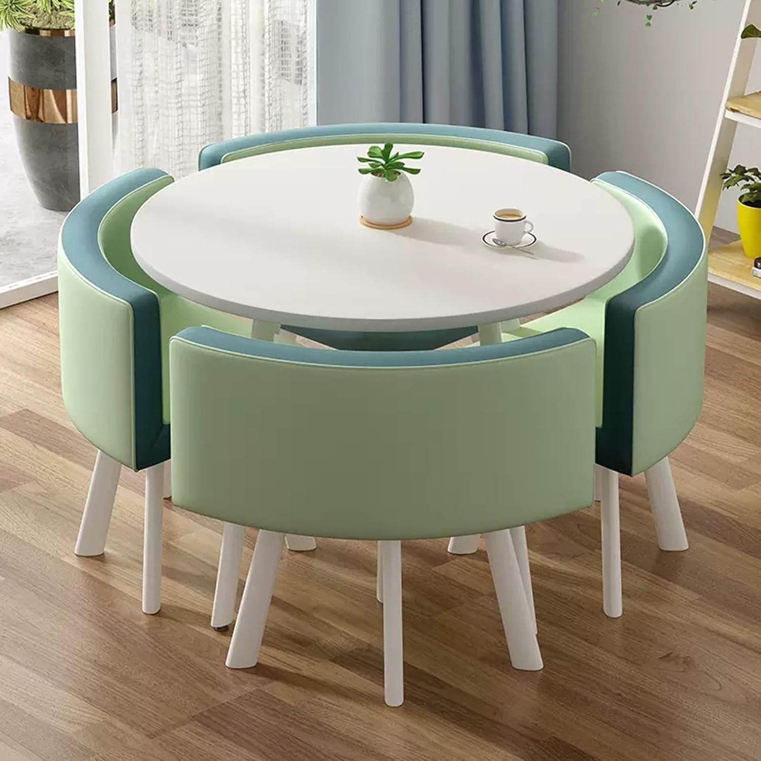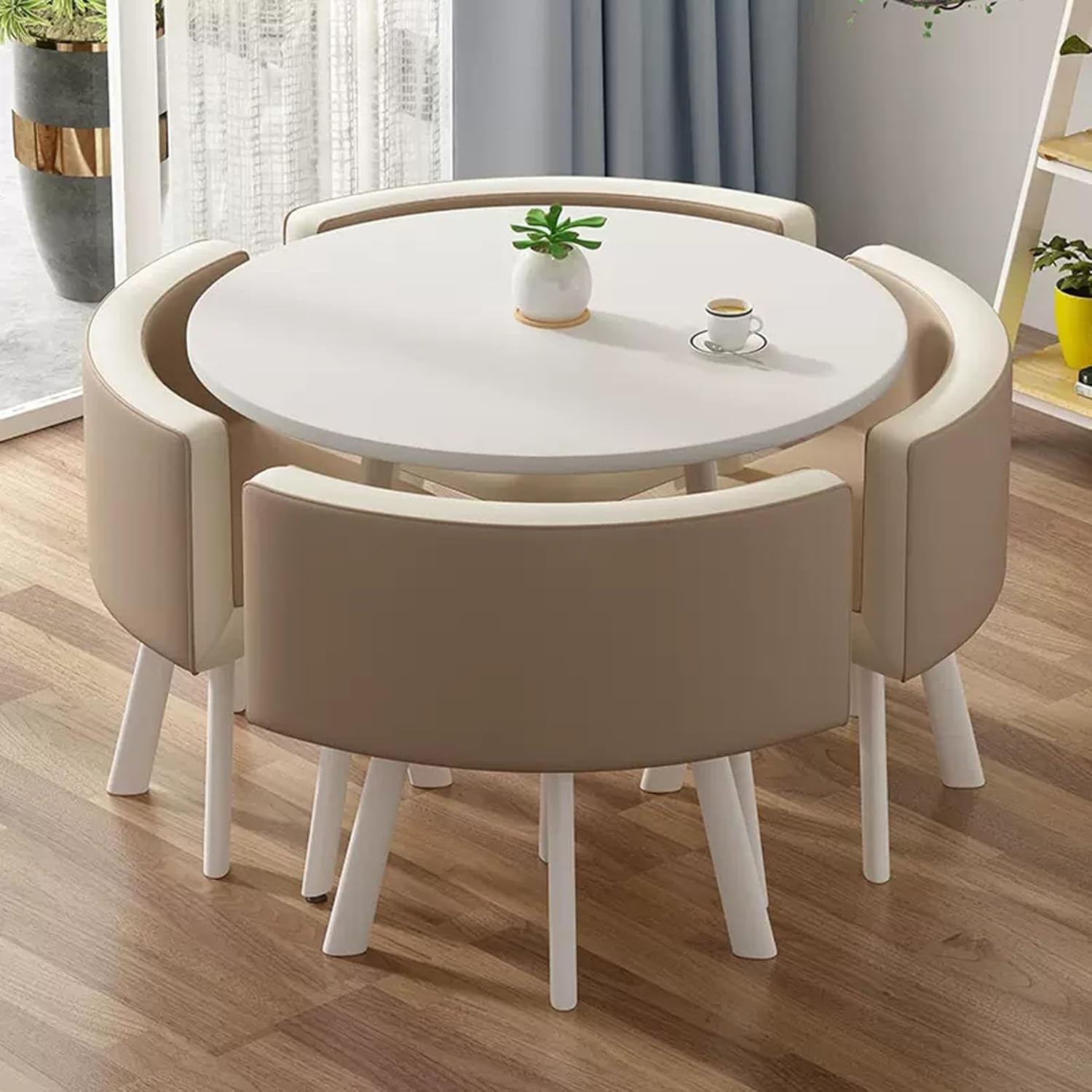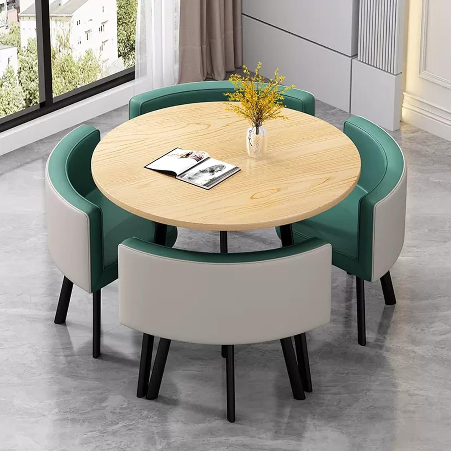 The table's contemporary design will look fantastic anywhere you choose to place it in the home, whether that be as a side table in the lounge or as a breakfast table in the kitchen. The perfect partner for the table is the Fabric Chair. This means it is sizeable enough without being obtrusive. You will be able to comfortably accommodate this round table in any room, even if space is tight.Product Parameters:Product Name: Table and chair combinationFeatures: Simple,generous,space savingColor: Reference pictureStyle: simple and modernBracket structure Material:MetallTable Shape: RoundDesk top Material:marble-likeTable top diameter: 80cm/31in,Table top thickness: 25mm /1inTable loading :300KGChairs material:PU leather,Total chair height: 70cm/27.6in,Seat height: 43cm/16.9inch,Seat loading: 100KGApplicable number: 4 peoplePacking method: assemblyPacking list:1*table,4*chairsWarm Tips:1. Size Description: The product is completely measured by hand and may have an error of 1-3 cm. Please refer to the actual items received.2. Picture description: The product is real. Due to problems with light, angle, display, etc., there may be slight chromatic aberration, please forgive me.