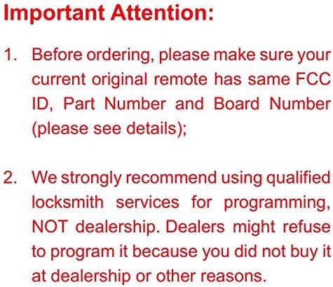 ★BexKeyless is a professional supplier to provide new replacement keyless entry remote control car key fob. We focus on high quality product with thoughtful service.★This is a one brand new replacement to match the original form and function.★Do-It-Yourself programming procedure is only available for some keys, and for the new smart keys, a diagnostic equipment is required to be connected to the vehicle to program the remote, so please find a local automotive locksmith or a dealer to confirm.★Please check with dealer to confirm the model(FCC ID/Chip/Frequency) of your vehicle before ordering and Please make sure the key your order is same as you have, if you have different remote, we cannot verified you can successful program the key.FCC ID: HYQ14FBA;Frequncy: 315MHZ;IC: 1551A-14FBA;Transmitter ID: 281451-2110 AGFitment:2015-2017 NX300H;2015-2017 NX200T;2017 LX570