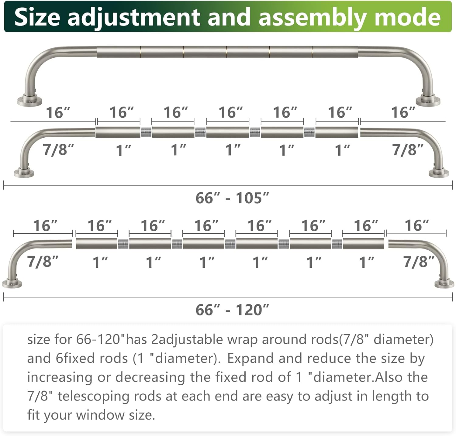 | Included Components | 1 piece of installation instruction card, 1 x adjustable telescopic bracket, 2 x stepped round base,5 x connector, 2X16"X7/8" wrap around rods,6X16"X1”"fixed rods, 6 x screw and anchor |