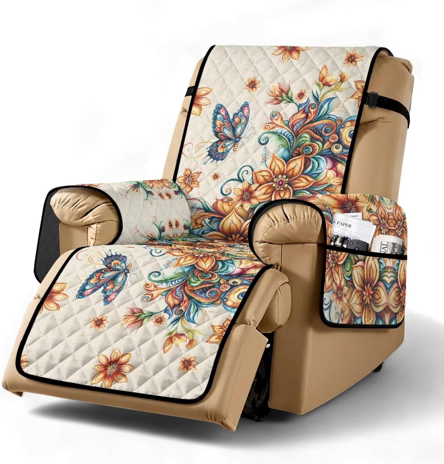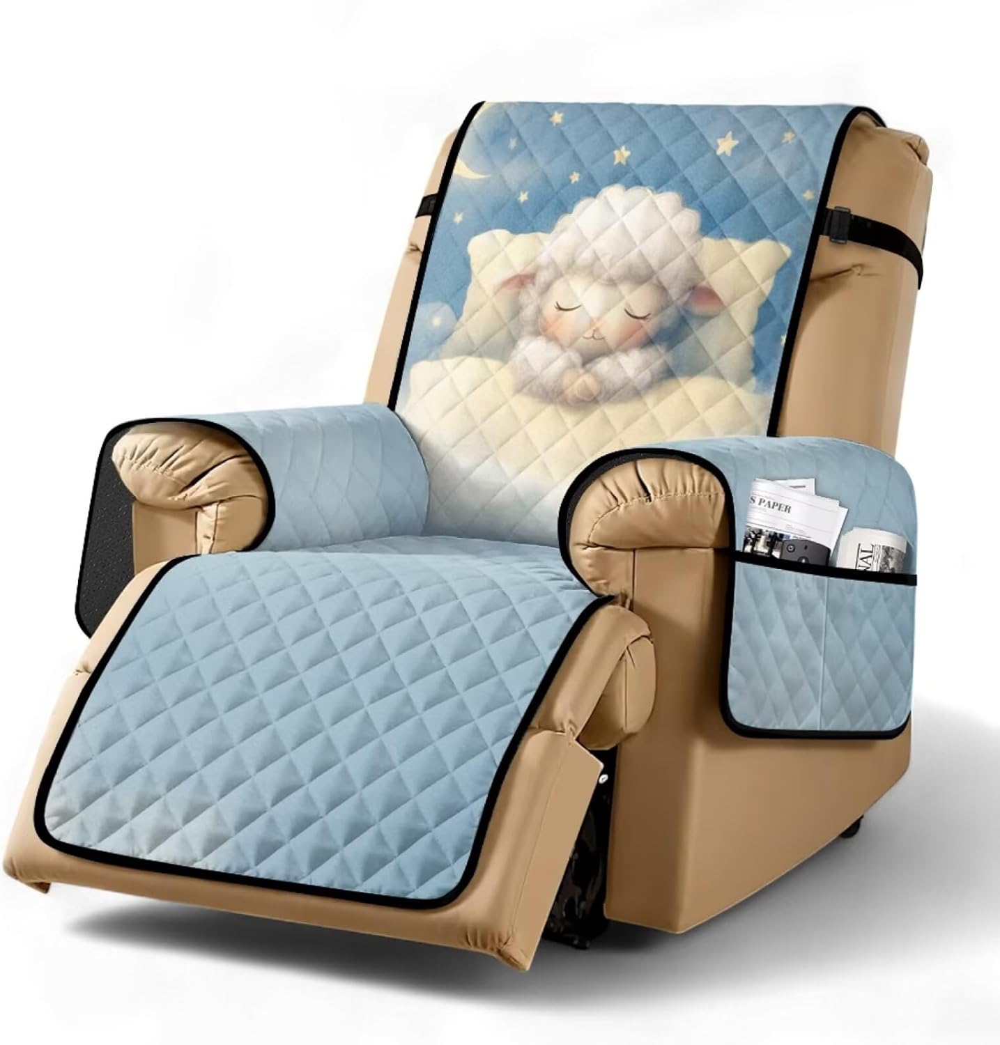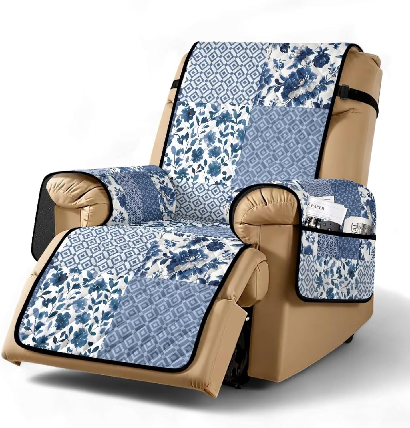 Refresh and protect your recliner chair with our custom-fit recliner slipcover, expertly designed to fit most standard recliners with a seat width of 23.6 inches, armrest width of 22.2 inches, and back length of 39.8 inches. Refer to the measurement guide in the product images for accuracy. The flexible, stretchable design allows you to tuck any excess fabric into the seams for a clean, tailored fit that looks professionally installed—no tools or assistance required. Crafted from a premium blend of polyester and spandex, this recliner cover offers a soft, comfortable feel while maintaining a snug, wrinkle-free fit. The unique colloidal non-slip backing, combined with elastic straps at the top, ensures the cover stays securely in place—even on smooth leather furniture. Say goodbye to shifting or sliding covers. Whether you're protecting against daily wear, pet claws, or kids'messes, this all-around protector guards your chair from scratches, dust, dirt, and pet hair, keeping your furniture looking fresh and new. More than just protection, our recliner sofa cover enhances your home decor with a range of stylish, modern patterns to match any interior. Two convenient side storage pockets provide easy access to remotes, glasses, books, or magazines, helping you keep your living space tidy. Installation is quick and intuitive—simply follow the included visual guide and you'll have it fitted in minutes. When it's time to clean, just remove the cover and toss it in the washing machine. Durable, practical, and beautifully designed, this recliner chair cover is the perfect solution for pet owners, families, and anyone who values both comfort and style.