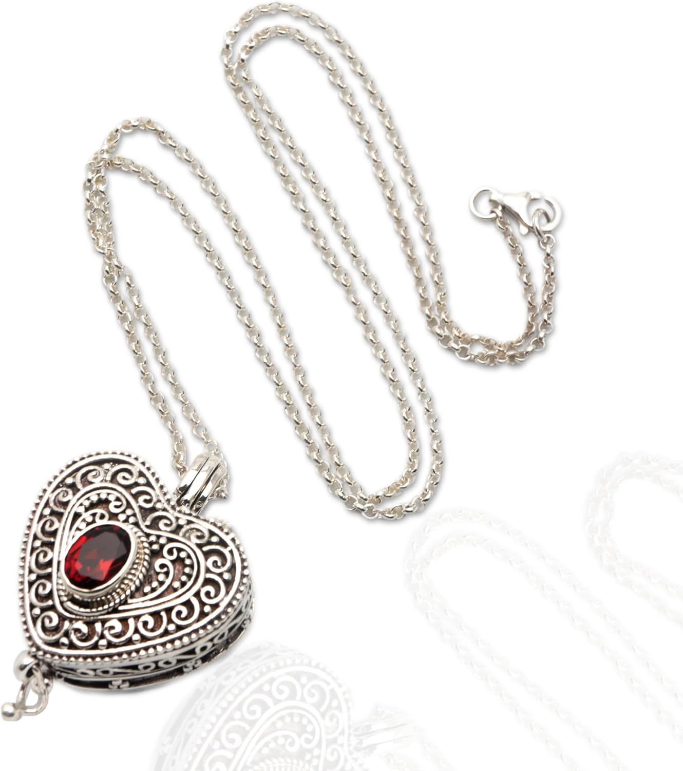 | Style | Heart-shaped pendant necklace with granulation techniques, deep red garnet, lobster claw clasp, rolo chain, and combination finish |