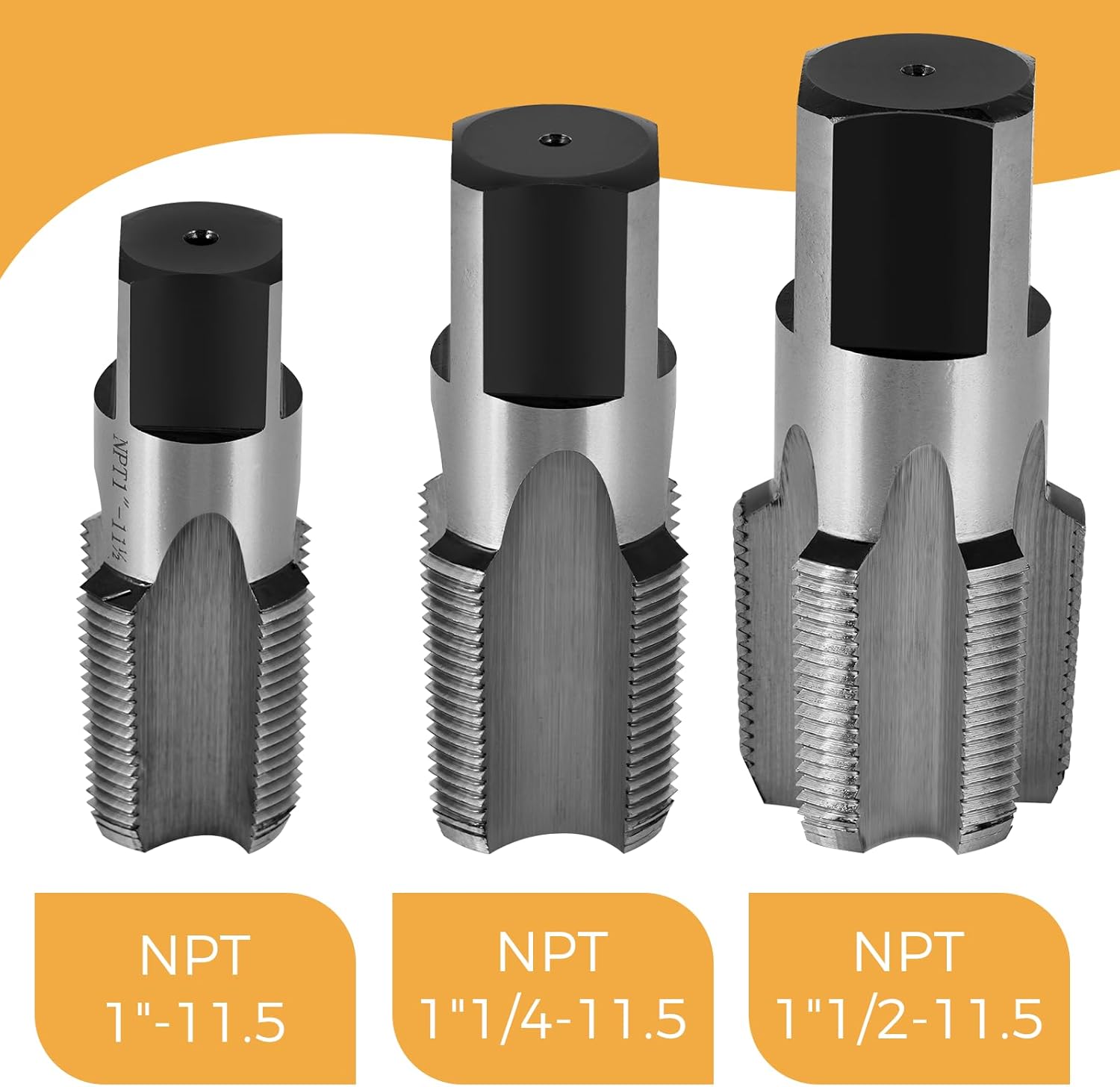 Package included: 3pcs NPT pipe taps 1"-11 1/2, 1-1/4"-11 1/2 and 1-1/2"-11 1/2.