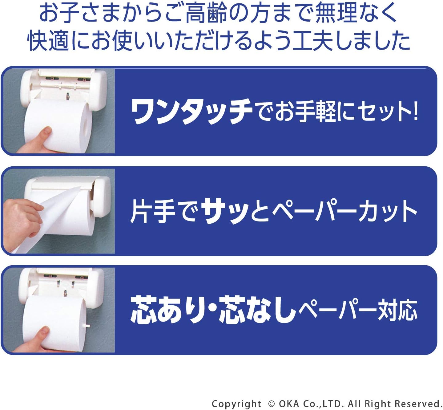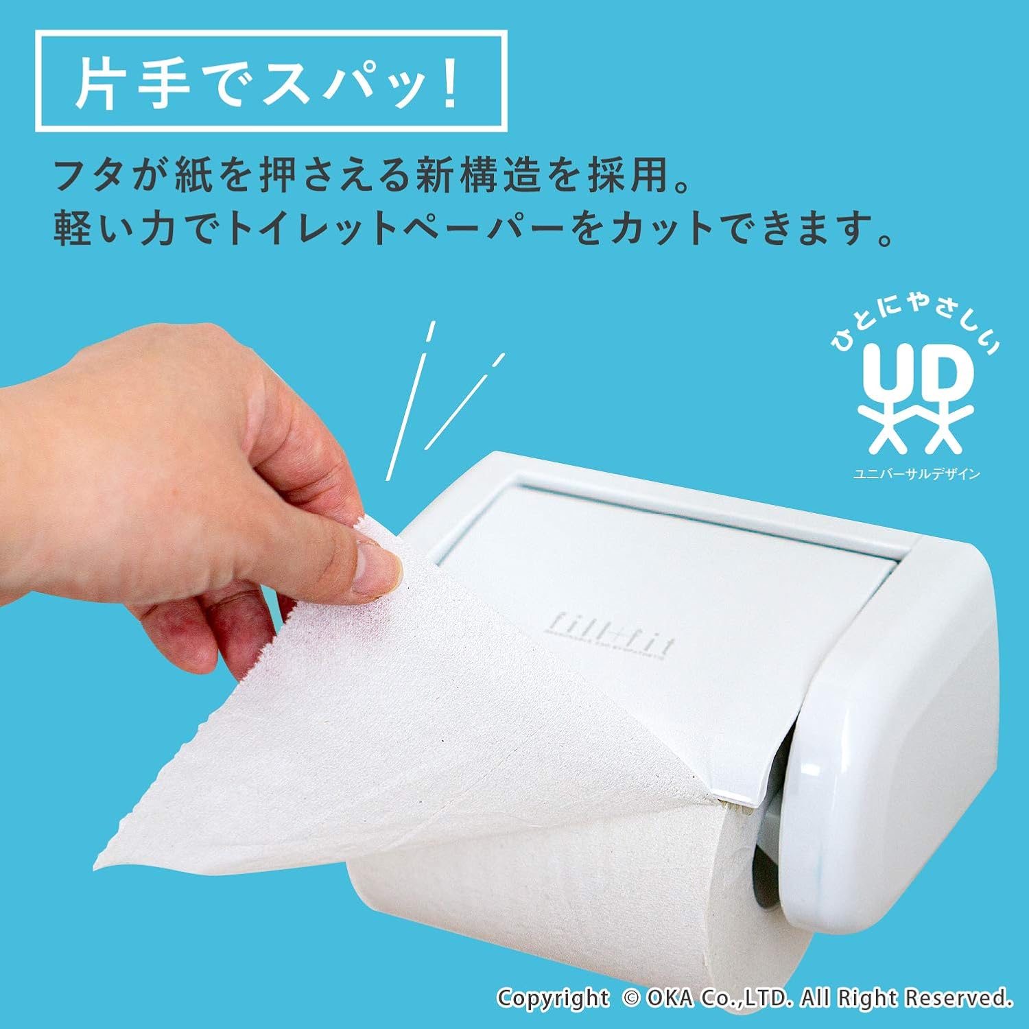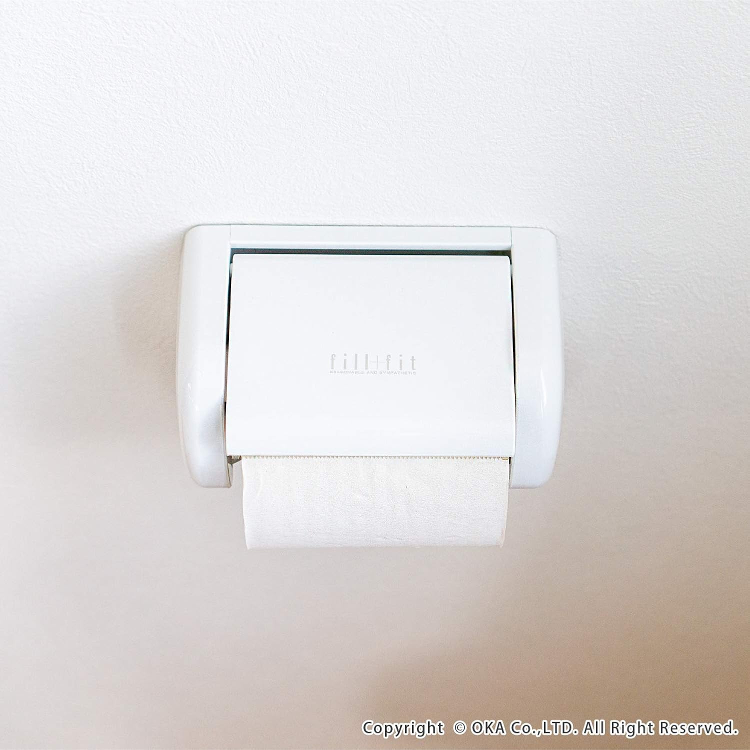 The fill fit one-touch paper holder features a lid to hold paper for easy one-handed cutting of toilet paper. The toilet paper replacement uses a single touch method that pushes the paper from the bottom for easy changing. The Oka fill+fit series is an idea based on the concept of "My Home Improvement" to bring convenience and comfort to your life.