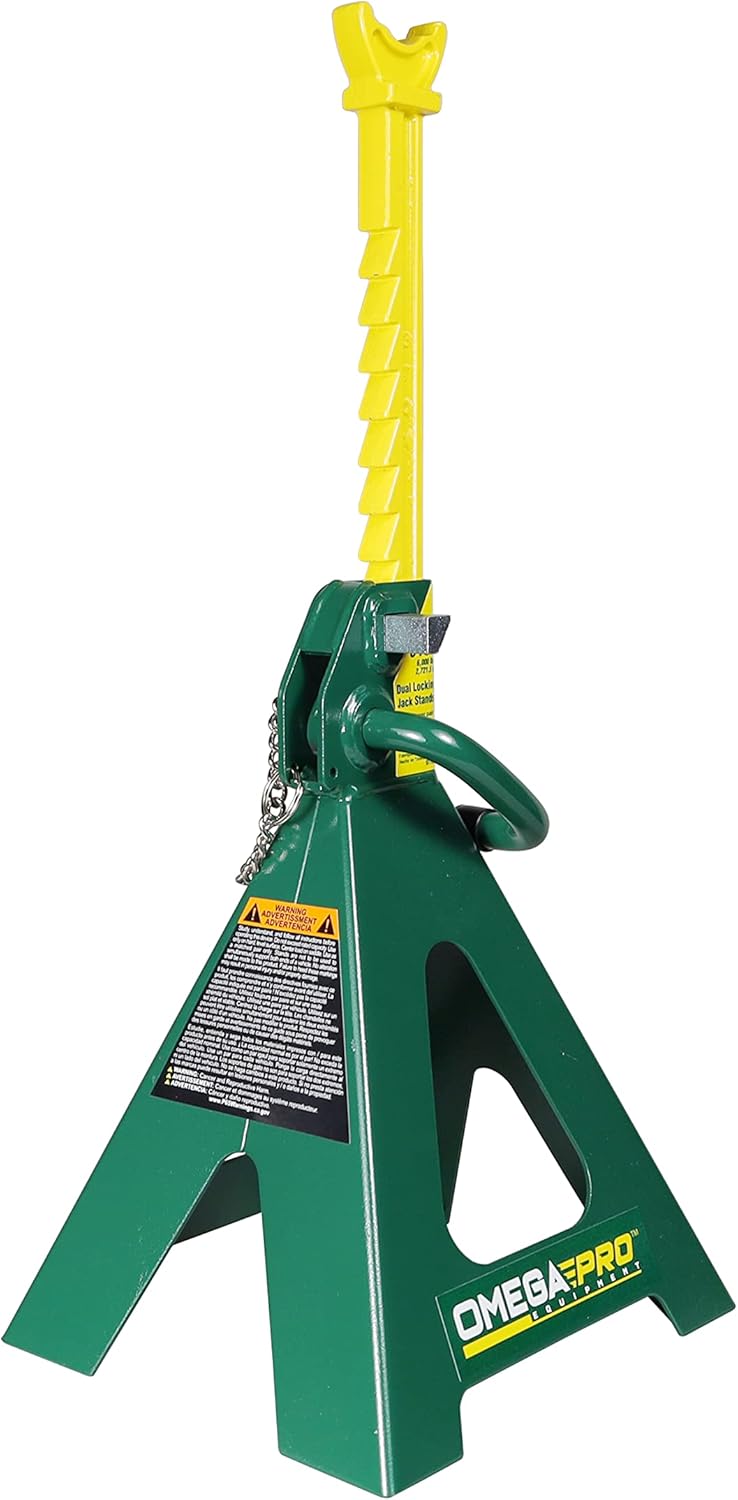 Omega Pro 3 Ton Double Pin Jack Stands - Premium Forged Steel Ratchet Bar Provides Greater Safety, 1 Pair Fully forged steel construction that is 2X stronger. Sturdy Forged steel ratchet bar with steel construction body for greater safety and durability. With a load capacity of 6,000lbs (3 ton), our 3-ton jack stands feature an adjustable height that ranges from 2-5/8” to 17-3/4” and a foot base of 6-3/4” x 7-1/2”. Forget about die-casting ratchet bars! Our ratchet bars are made of one-piece forged steel which is well known to be tougher and almost unbreakable. This in turn provides better safety and durability. Dual lock mechanism with both handle and mobility pin for a double peace of mind. Multi-position ratchet bar has a saw tooth design, allowing for quick height adjustments that lock into place. Ideal for home, Auto, truck service, farm, and shop/garage uses. Meets or exceeds ANSI/PALD standards. Proudly Engineered in Taiwan with industrial grade materials, Omega Pro provide consistent performance with increased toughness and durability. It is a must-have for professionals, home improvements and DIY, Collectors and Mechanics.Vehicle Service Type: TruckMaterial: Alloy SteelLoad Capacity: 3 tonBrand: Omega ProModel: 3 Ton Jack StandsItem Weight: 9.7 poundsPackage Dimension: 16.4 x 10.4 x 9.0 inchesCountry of Origin: TaiwanItem Model Number : SF7113701Manufacturer Warranty: One Year SF7113701 is covered with One Year manufacturer warranty from the date of the purchase.