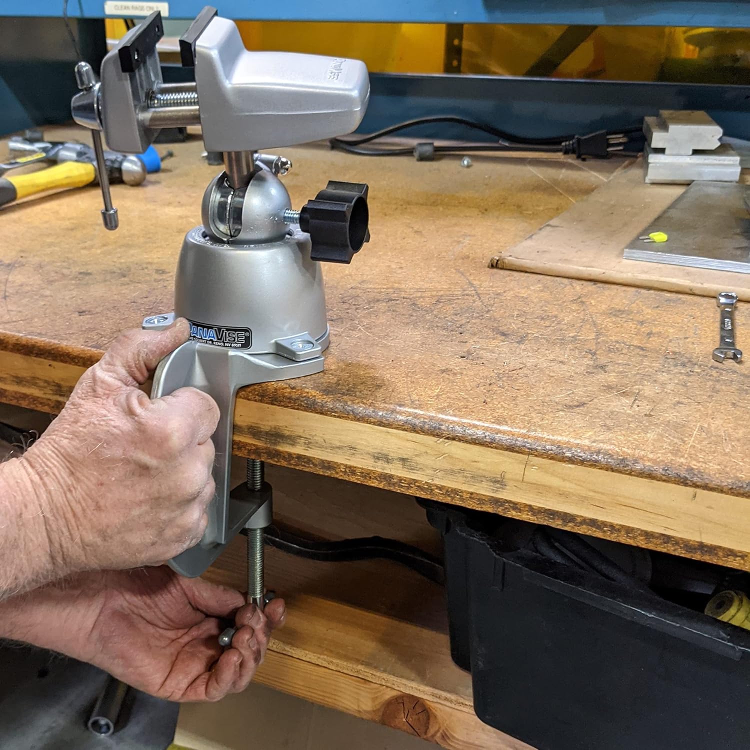 The PanaVise Heavy-Duty Clamping Vise Combo is a must for every workbench. This combo includes the original 303 PanaVise head and base plus the bench clamp base mount. The 303 head is known around the world as a work-holding tool for hobbies, electronics, small home repairs, and work bench environments. The standard PanaVise 300 base is controlled by an easy-to-use single knob that allows head movement through 3 planes: 90° tilt, 360° turn, and 360° rotation. The Model 311, heavy-duty clamping base clamps to anything up to 3-7/16 in. (87.3 mm) thick and includes 4 non-marring, anti-skid neoprene pads for additional anti-slip characteristics without excessive tightening of the clamping screw. A finger grip is added for convenience.