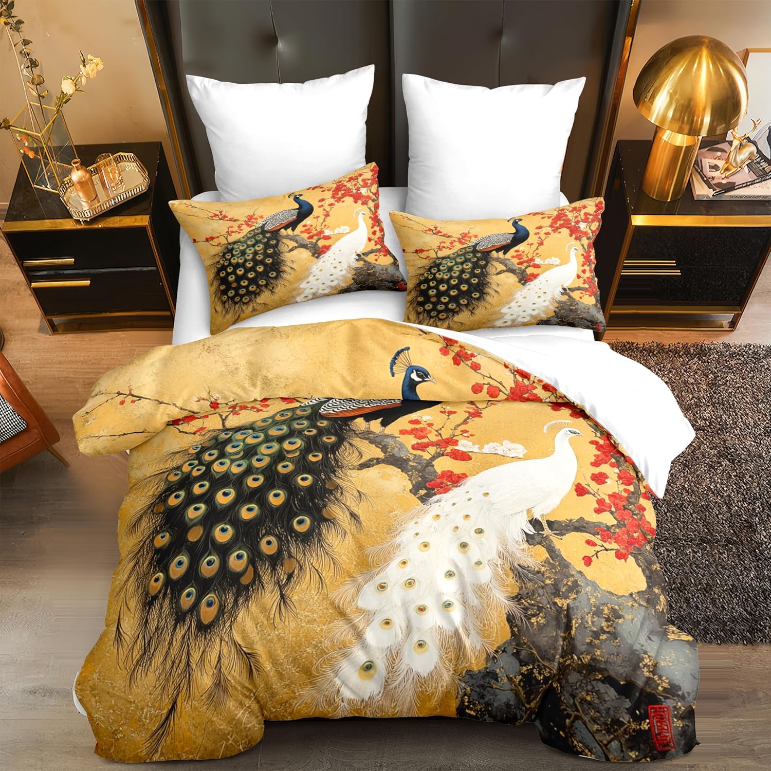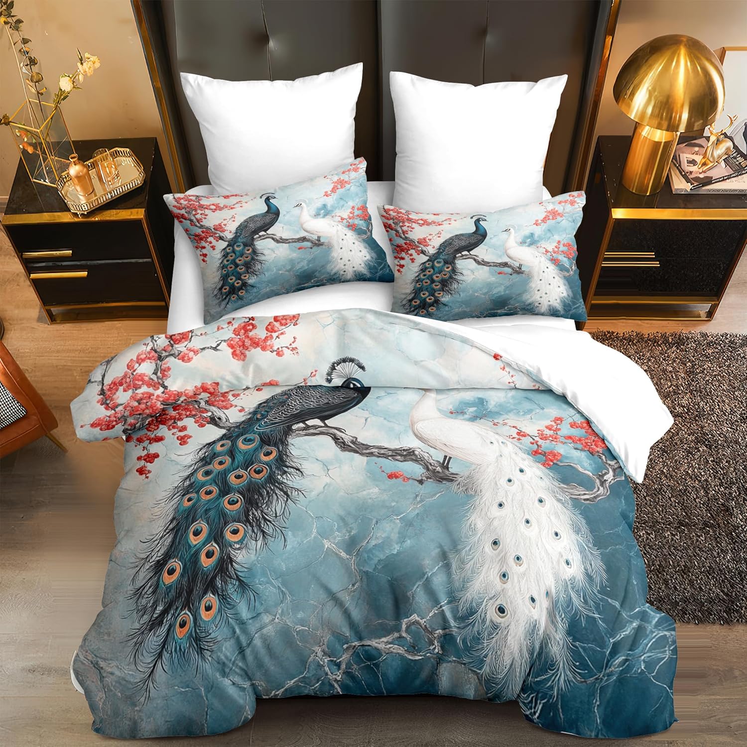 Material: This peacock comforter set queen size is made of ultra-fine fiber Continuous softening after each wash. This red floral spring animal bedding set is very lightweight, without shrinking, anti pilling, anti wrinkle, durable and long-lasting. This peacock comforter does not use chemical to harm your and your family's health. Size Information: 1 Queen size peacock comforter set 90"X 90" (228cm*228cm) & 2 pillow cases 20"X 30" (50cm*75cm). Pillow and sheet are NOT included. Unique Design: Our red floral spring animal comforter pattern is printed using 3D technology, with clear pattern and anti fading. The U-shape stitching ensures the microfiber filler is sewn tightly to prevent clumping or shifting. Due to our use of vacuum packaging, please gently pat this peacock bedding sets after receiving the goods to make them fluffy again. The unique design of this comforter perfectly matches other interior decoration. Usage: The best choice for Valentine's Day, Birthday, wedding anniversary, Christmas and other holiday. The red floral spring animal bedding set for bedroom, dorm room, hotel, guest room, outing, RVs, camping and other place. Present for family, parents, children, friends, boys, girls, adult, women, men. Tips: The peacock comforter set & pillow shams are printed on the front side, the back is white. Due to monitor differences, there are some color differences between the image and the actual product. Due to manual measurement issues, please allow an error of 2-3 centimeters. Machine wash in cold water and tumble dry at low temperature. Service: We are committed to providing comfortable bedding, so that we provide you with 365 days of high-quality sleep. Welcome to our store to purchase more products. If you have any questions, please contact us and we will process your request as soon as possible within 24 hours.