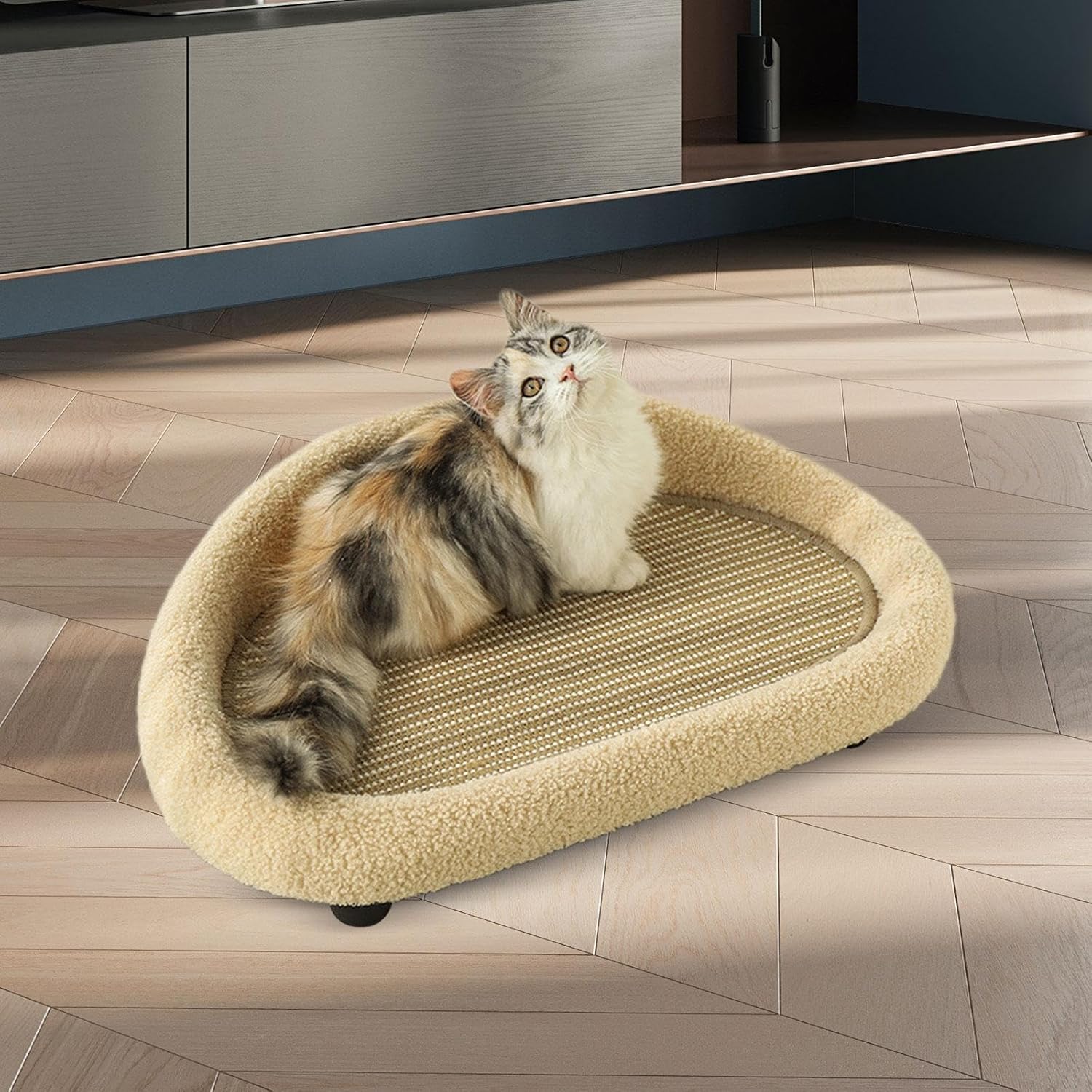 Description: - 【Multifunctional Design】: Pet Couch Bed integrate cat , cat sofa and cat bed. It's made from durable linen that won't shed and is scratch resistant, making it the good tool for sharpening your pet's claws. - 【Suitable for Small Pets】: Pet Couch Bed is suitable for small and medium sized dogs and cats, cats or dogs weighing no more than 16 pounds. - 【Stylish and Comfortable】: The Pet Sofa adds elegance and style to any room and is comfortable to the touch, providing a warm and comfortable place for your pet to rest. - 【Anti Slip Design】:Cat Couch Bed's small table legs adopt an anti slip design, which helps to fix the sofa on smooth surfaces and adds moisture protection. - 【Convenient and practical】: Pet Sofa Bed can be in pet shops, pet , pet shops, living rooms, bedrooms, etc.Size Chart:18cmx61cmx38cm/7.09inchx24.02inchx14.96inchPackage Includes:1 Pet Couch BedNote:Please allow slightly errors 1-2cm differences due to manual measurement.