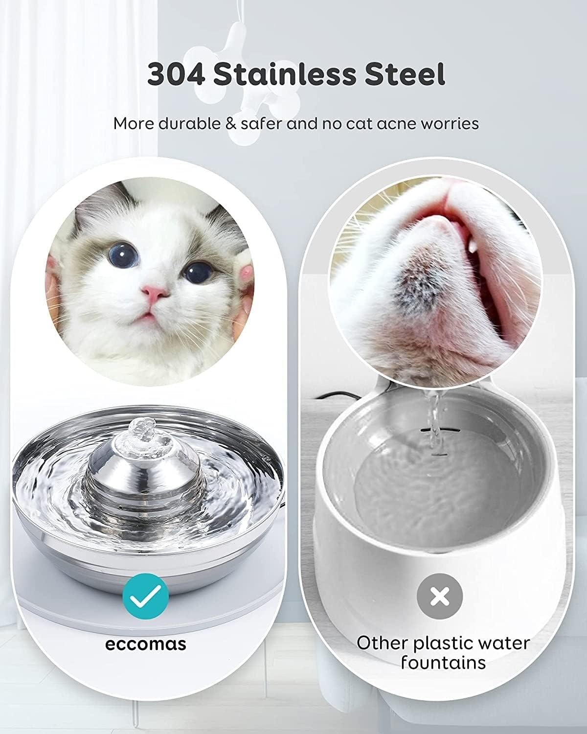 It's a stress-free way to makes sure your pal always has food when she's hungry [2-in-1 Design Perfect for Multi-pet Families] An absolutely cost-effective combination- Stainless steel feeding bowl and fountain & silicone mat Meet the feeding and drinking needs of multiple pet families.Open bowl-design holds water even if your power goes out and it's easier to see the water level to add water in time.2L/67oz water capacity enough for a dinking 2 weeks and 248ml food capacity enough for a eating 3-5days even when the owner is out of travel. If you have any questions, welcome to contact our amazing customer service.