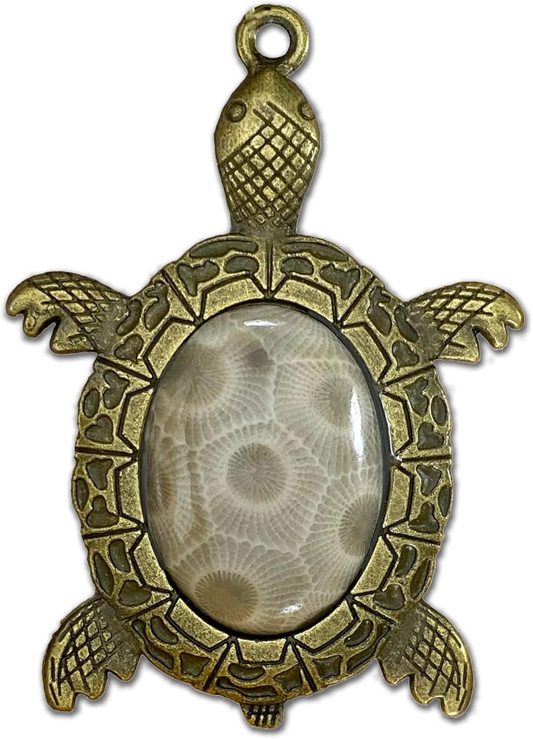 Turtle pendant with a handcrafted Petoskey Stone cabochon available in antique bronze or antique silver. The bronze option includes a 20" antique bronze base metal chain and the antique silver option includes a 20" stainless steel chain.Note: The pendant you receive will have a Petoskey Stone pattern similar to the one pictured. Since each stone is one-of-a-kind, there will be variations to the exact stone you receive.Petoskey stone is a rock and a fossil, often pebble-shaped, that is composed of a fossilized rugose coral, Hexagonaria percarinata.The name Petoskey Stone likely came about because it was found and sold as a souvenir from the Petoskey area. The name Petoskey appears to have originated late in the 18th century. Its roots stem from an Ottawa Indian legend. In 1965, Petoskey stone was named the state stone of Michigan.Petoskey Stone helps us recognize and acknowledge our emotions, a very important step in learning to love ourselves. It works on both the Third Eye and Crown Chakras. It helps us develop our intuitive abilities. This is a good stone to help anyone with their creative side to bring abundance to projects.